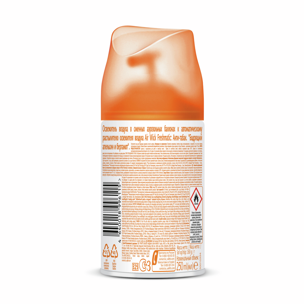 Освежитель воздуха аэрозольный AirWick Freshmatic Анти-табак. Бодрящий апельсин и бергамот сменный баллон, 250мл