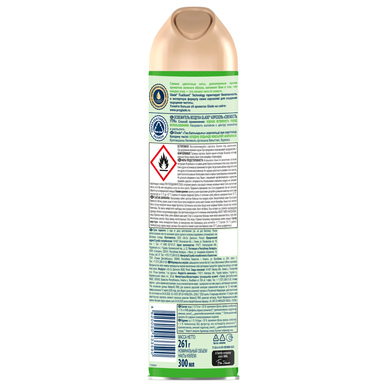 Свежие цветочные ноты, дополненные ярким ароматом зелёного яблока, напомнят Вам о том, что каждое утро – это начало чего-то нового. Glade TrueScent Technology гарантирует безопасность и экспертную формулу своих аэрозолей для создания ощущения чистоты.