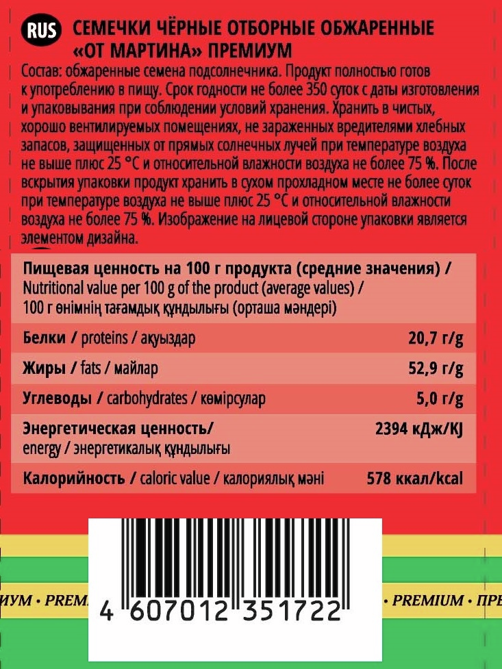 Семечки отборные От Мартина, 300 г – вкусный и полезный продукт. Семена подсолнечника содержат большое количество витамина D, которого здесь больше даже, чем в печени трески. Входящие в состав аминокислоты способствуют улучшению кожи и слизистых оболочек, нормализуют кислотно-щелочной баланс, стабилизируют работу сердечно-сосудистой системы. Семечки могут замедлить процесс старения и снизить холестерин в крови, а цинк, который также есть в этом продукте, отвечает за блестящие и красивые волосы. Прочная оболочка семечек надежно защищает содержимое от повреждения и позволяет сохранить все полезные свойства зерен. Однако не стоит употреблять в пищу слишком много жареных семечек, ведь они достаточно калорийны. Поэтому, если вы придерживаетесь диеты, есть этот снек в неограниченном количестве нежелательно, а вот умеренное потребление будет способствовать насыщению организма полезными веществами и снятию нервного напряжения. Компания Мартин была основана в 2000 г. 18 лет работы над улучшением селекции, технологии обжарки и условий хранения не прошли даром – сейчас компания Мартин предлагает самые лучшие отборные семечки, которые хорошо известны не только в России, но и за рубежом. Выбор сорта подсолнечника и места выращивания играет важную роль для достижения желаемого результата. Новейшая техника и высочайшая квалификация специалистов – вот две основные составляющие успеха этой торговой марки! Мартин постоянно анализирует современные технологии и использует их при производстве своей продукции, что позволяет ТМ внедрять инновационные решения. Семечки компании Мартин отличаются великолепным качеством и неповторимым вкусом.