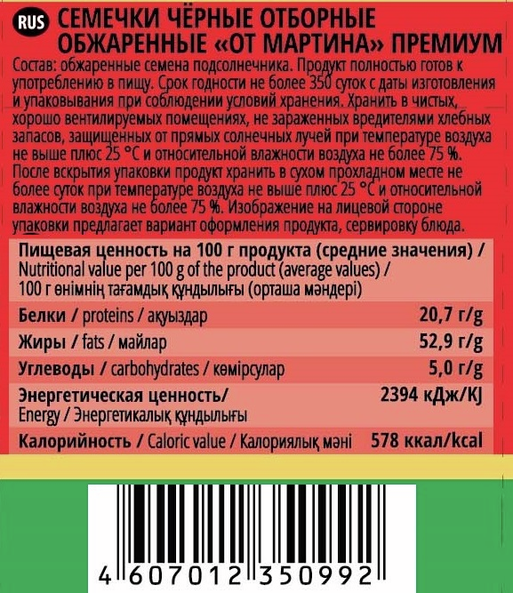 От Мартина Семечки отборные жаренные 100 г – вкусный продукт, которые очень популярен как среди взрослых, так и среди детей. С ним можно скрасить свой досуг или отвлечься во время рабочего перерыва. В семенах подсолнечника содержится большой спектр веществ, необходимых организму человека. Это не только белки, жиры и углеводы, но и различные витамины. Среди них есть такие, как А (важен для зрения), B (полезен для кожи, волос, нервной системы), E (сильный антиоксидант) и некоторые другие. Также в семенах подсолнечника содержатся магний, кальций, калий, цинк, селен и ряд других макро- и микроэлементов. Незаменимые аминокислоты нормализуют жировой обмена, а ненасыщенные жирные кислоты положительно влияют на работы кровеносной и сердечно-сосудистой систем. Продукт поставляется в практичной и герметичной упаковке, которая надежно защищает содержимое от внешнего воздействия. Компания Мартин, которая является производителем данной продукции, была основана в 2000 году в Московской области. За все годы своего существования она вложила немало сил в улучшении селекции, технологии обжарки и создании необходимых условий для хранения готовой продукции. Благодаря этому компания предлагает потребителям отборные семечки, которые известны не только в РФ, но и некоторых других странах. Сегодня Мартин предлагает свыше ста наименований продукции, для изготовления которой используются только экологичные компоненты. Высокие результаты работы компании были неоднократно отмечены различными наградами. В частности, высокое качество продукции было подтверждено призами на таких международных выставках, как Зеленая неделя, Продэкспо, WorldFood и ArmProd Expo.