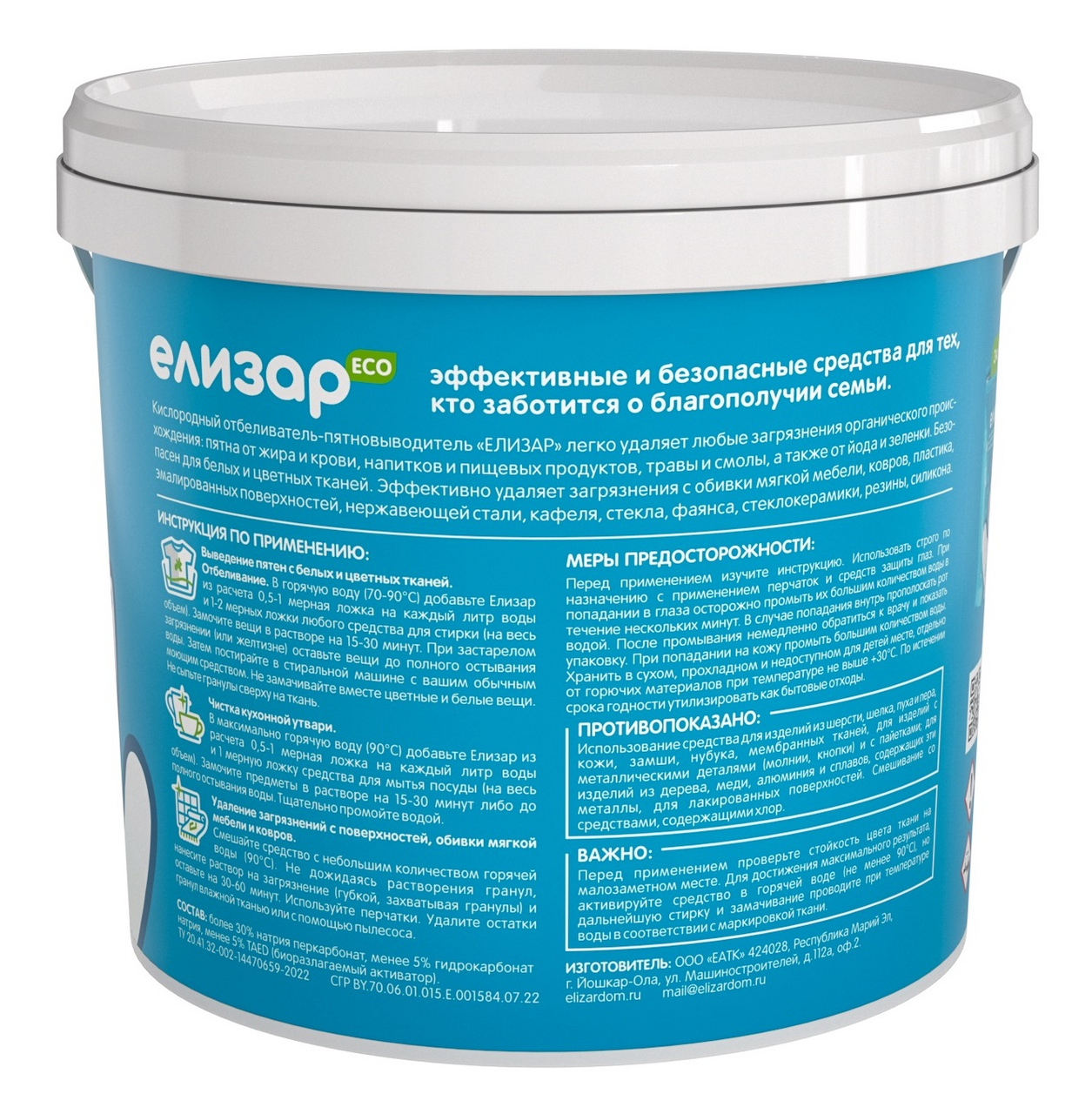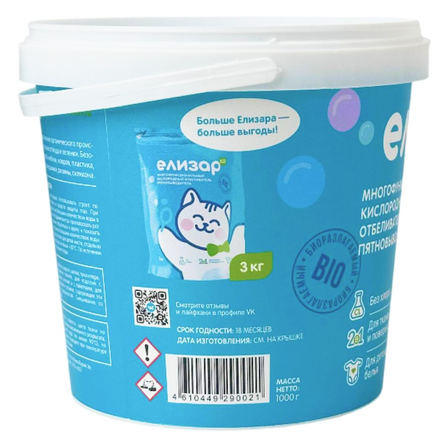 Мощное универсальное средство (отбеливатель, пятновыводитель, очиститель) для чистоты без усилий и заморочек. От чистки въевшегося налета на старой кастрюльке до отбеливания носочков или тюля - кислородный пятновыводитель Елизар работает везде и загрязнение уходит само собой.