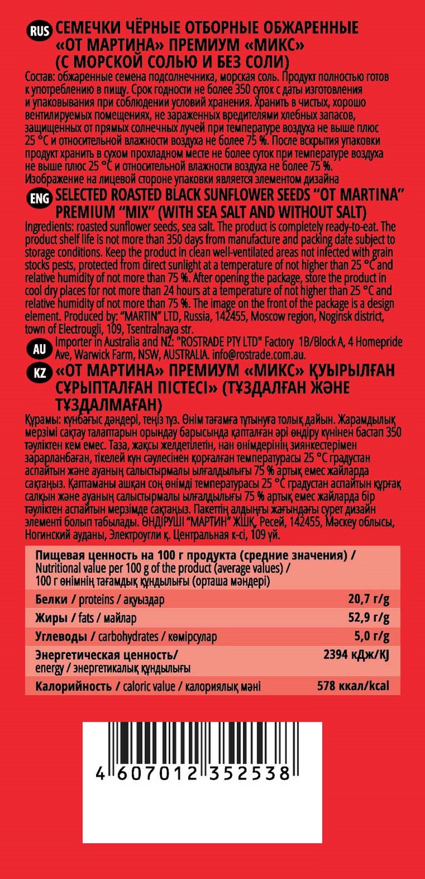 Семечки От Мартина отборные жареные Микс соленых с несолеными, 200 г скрасят любой вечер за посиделкам или душевными разговорами. Этот продукт любят как взрослые, так и дети. В одном пакетике соединены соленые и несоленые семечки, что делает этот продукт оригинальным и позволяет ощутить разные вкусы. При всем этом семена подсолнечника очень полезны. Они содержат большое количество витамина D, которого здесь больше даже, чем в печени трески. Входящие в состав аминокислоты способствуют улучшению кожи и слизистых оболочек, нормализуют кислотно-щелочной баланс, стабилизируют работу сердечно-сосудистой системы. Семечки могут замедлить процесс старения и снизить холестерин в крови, а цинк, который также есть в этом продукте, отвечает за блестящие и красивые волосы. Прочная оболочка семечек надежно защищает содержимое от повреждения и позволяет сохранить все полезные свойства зерен. Однако не стоит употреблять в пищу слишком много жареных семечек, ведь они достаточно калорийны. Поэтому, если вы придерживаетесь диеты, есть этот снек в неограниченном количестве нежелательно, а вот умеренное потребление будет способствовать насыщению организма полезными веществами и снятию нервного напряжения. Компания Мартин была основана в 2000 г. 18 лет работы над улучшением селекции, технологии обжарки и условий хранения не прошли даром – сейчас компания Мартин предлагает самые лучшие отборные семечки, которые хорошо известны не только в России, но и за рубежом. Выбор сорта подсолнечника и места выращивания играет важную роль для достижения желаемого результата. Новейшая техника и высочайшая квалификация специалистов – вот две основные составляющие успеха этой торговой марки! Мартин постоянно анализирует современные технологии и использует их при производстве своей продукции, что позволяет ТМ внедрять инновационные решения. Семечки компании Мартин отличаются великолепным качеством и неповторимым вкусом.