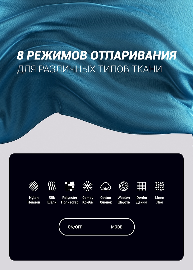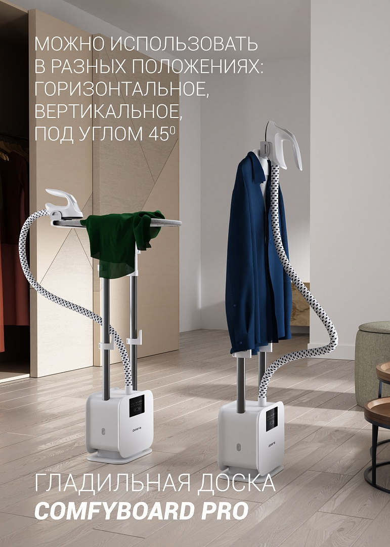 3 в 1: Отпариватель, утюг и гладильная доска. Идеальное решение для ухода за деликатными тканями и одеждой сложного кроя. Готовность к работе через 30 секунд. Постоянный пар высокой мощности - 45 г/мин. 8 режимов отпаривания для различных типов ткани. Съемный бак объемом 1,6 л. Система защиты от накипи. Безопасен для всех типов ткани. Управление режимами подачи пара с ручки распылителя. Гладильная доска ComfyBoard Pro – можно использовать в разных положениях. Мощность: 2000 Вт.