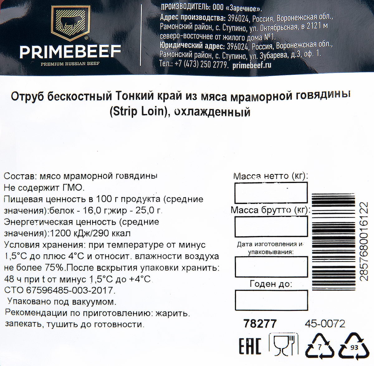 Стейк Стриплойн говяжий по достоинству оценят кулинарные гурманы. Его получают из так называемого тонкого края или спинной части туши. Готовить стейк можно двумя способами: жарить на обычной сковороде или сковороде-гриль либо запекать в духовке. Мясо приправляют копченой солью, черным перцем и пряными травами. Для получения наиболее нежной и сочной текстуры говяжьи стейки обычно доводят до степени прожарки Medium или Medium Rare. Подчеркнуть насыщенный мясной вкус готового блюда можно, используя перечный соус на сливочной основе. Хорошим гарниром к стейку станут свежие или запеченные на гриле овощи, зелень, рис. Стейк Стриплойн – это не только аппетитное, но и очень полезное мясо. Говядина является незаменимым источником высококлассного белка и аминокислот, витаминов из группы В, Е и К. Она богата калием, фосфором, железом, натрием и другими необходимыми для здоровья элементами. При регулярном употреблении в пищу говяжьи стейки укрепляют костную и мышечную ткань, предотвращают риск развития анемии, положительно сказываются на состоянии кожи и волос, активизируют обмен веществ, повышают иммунитет. Продукт помещен в защитную упаковку, ��оторая надежно сохраняет свежесть мяса в течение всего срока годности.