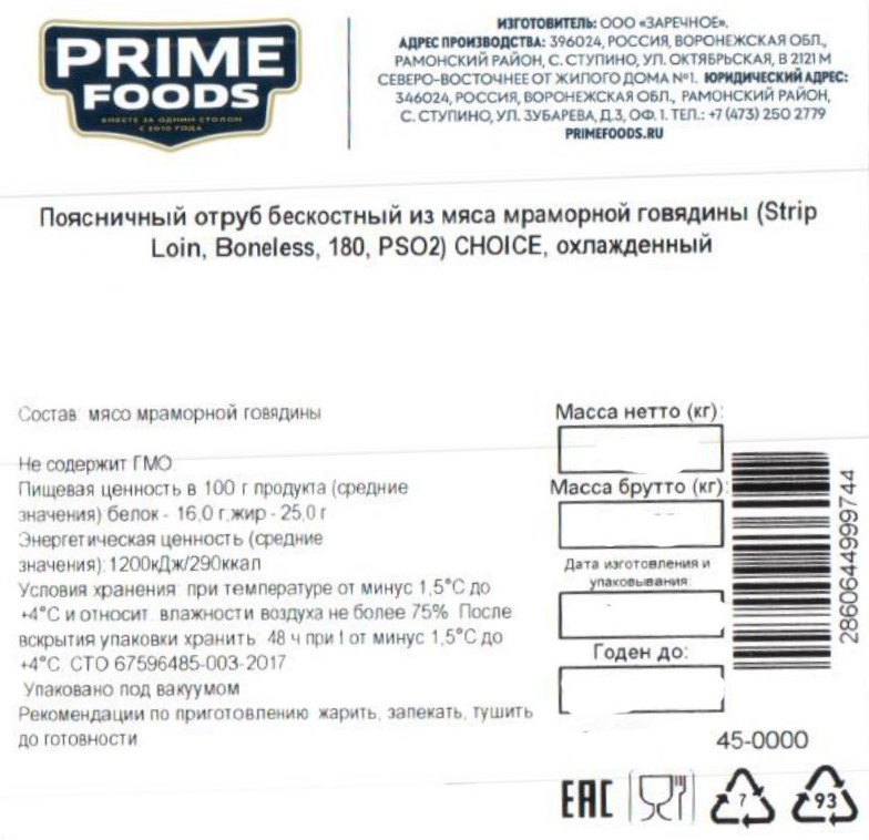 Отруб поясничный из мраморной говядины Primebeef бескостный охлажденный, ~4.5кг