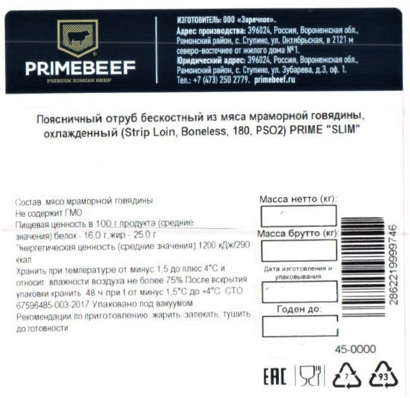 Отруб поясничный из мраморной говядины Primebeef Prime Slim бескостный охлажденный, ~3.5кг
