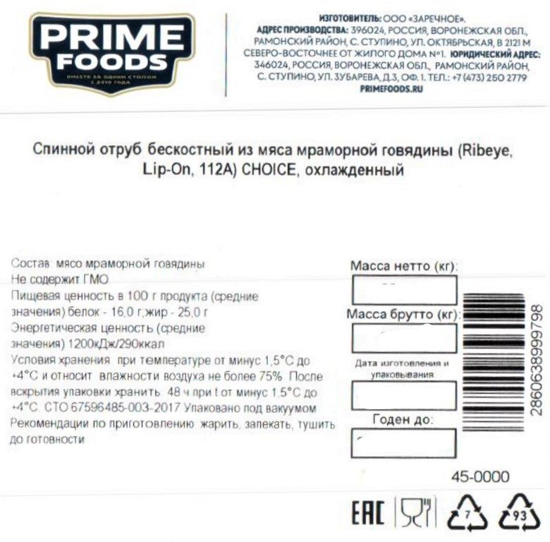 Отруб спинной из мраморной говядины Primebeef бескостный охлажденный, ~5.5кг
