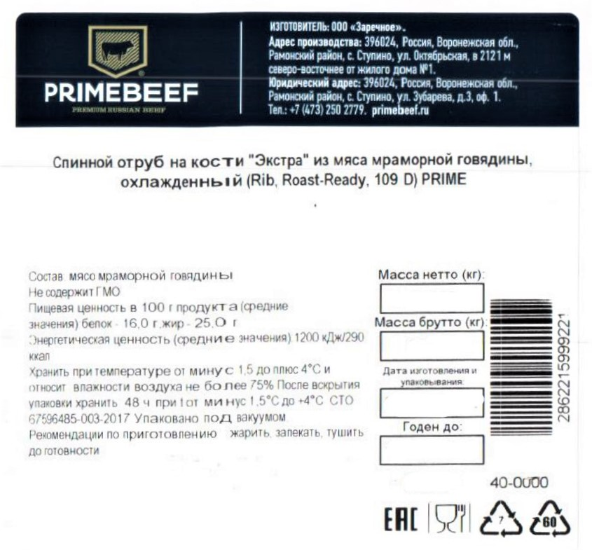 Отруб спинной из мраморной говядины Primebeef Prime Экстра на кости охлажденный, ~8кг