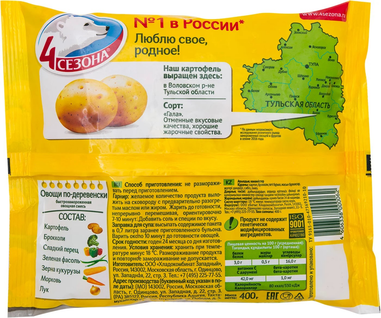 Смесь 4 сезона по-деревенски овощная быстрозамороженная, 400г – это универсальный вариант для любого приема пищи. С ней можно готовить различные рагу, супы, жаркое и запеканки. Продукт состоит из нарезанных овощей: картофеля, моркови, брокколи, сладкого перца, лука, стручковой фасоли, кукурузы. Все компоненты обработаны методом шоковой заморозки, поэтому сохраняют в себе все полезные микроэлементы и витамины. Смесь хорошо сочетается с мясом, курицей или рыбой. Она не требует специальных подготовительных процедур или разморозки. Все ингредиенты выращиваются на территории России и проходят тщательный отбор.