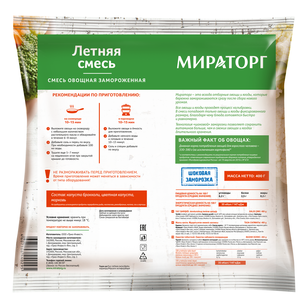 Овощная смесь Мираторг Летняя замороженная, 400г состоит из отборных соцветий цветной капусты, моркови и капусты брокколи. Лучшие овощи категории А заморожены по шоковой технологии, чтобы сохранить все богатство вкуса и аромата свежих продуктов. Смесь богата витаминами, растительными белками и минеральными веществами — то, что нужно для правильного рациона.