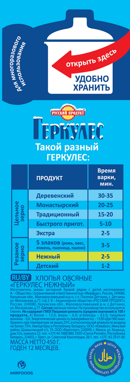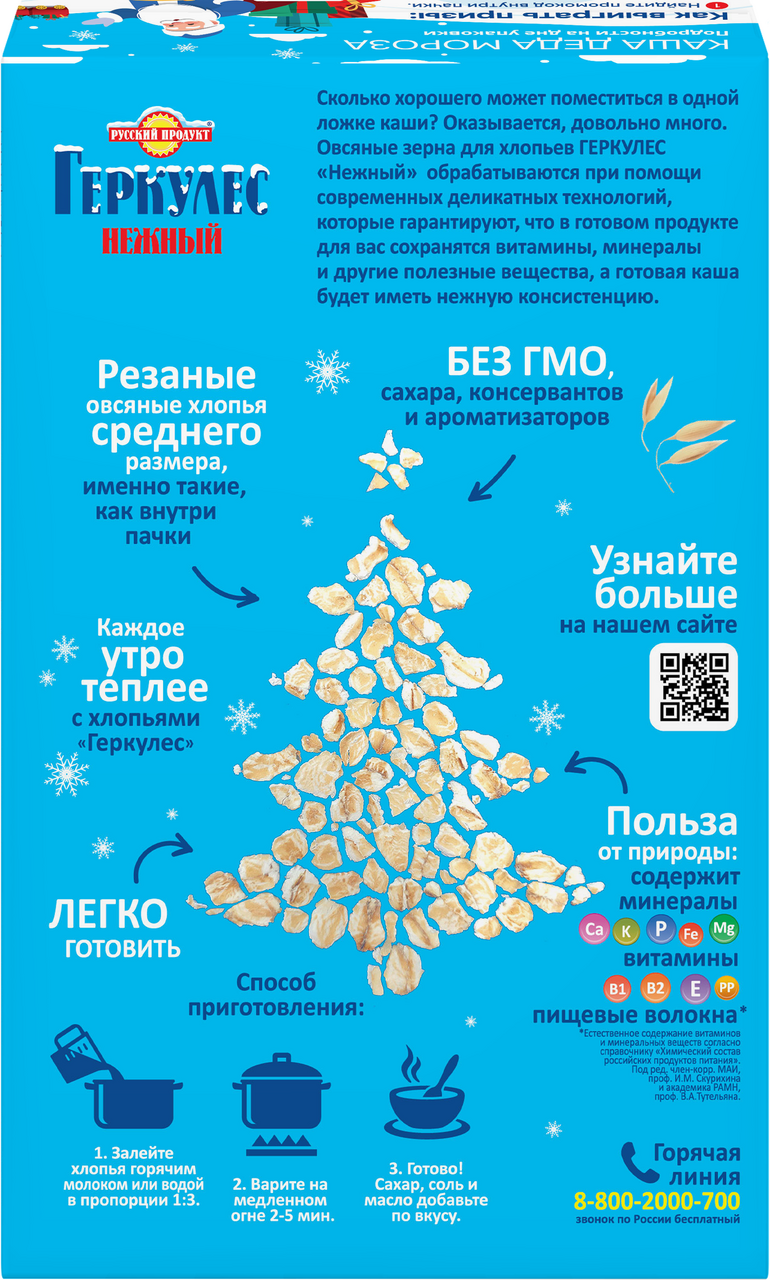 Геркулес Нежный создан для всей семьи! Эти деликатно измельченные хлопья готовятся всего 2-3 минуты. А нежная консистенция приготовленной каши делает продукт идеальным для начала дня!