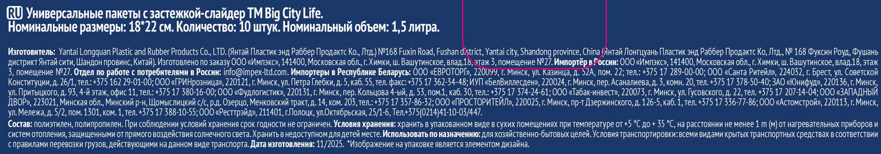 Пакет-слайдер Big City Life универсальный 1.5л 18 x 22см, 10шт