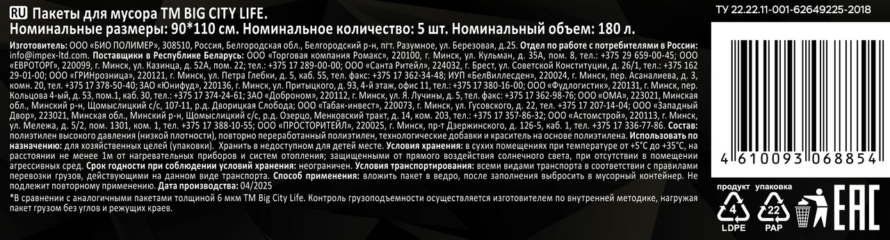 Пакеты для мусора Big City Life Black Diamond 180л 50мкм, 5шт