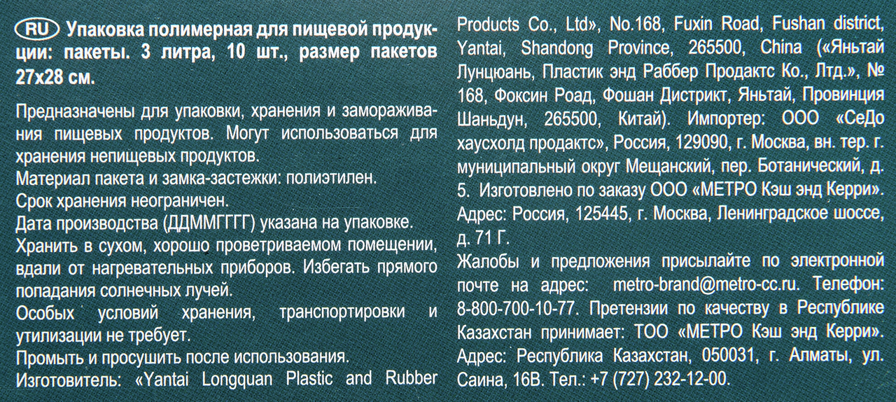METRO PROFESSIONAL Пакеты для пищевых продуктов 27x28 см 10 шт., 3 л обладают высокой степенью герметичности, предотвращая попадание воздуха и сохраняя аромат и вкус продуктов на долгий срок. Откройте для себя удобство и надежность в хранении продуктов! Пакеты водонепроницаемые. Они обеспечивают надежную защиту от влаги, что делает их идеальными для хранения продуктов влажного типа, таких как фрукты или овощи. Они не только эффективны, но и легки в использовании. Предназначены для упаковки, хранения, замораживания пищевой продукции.