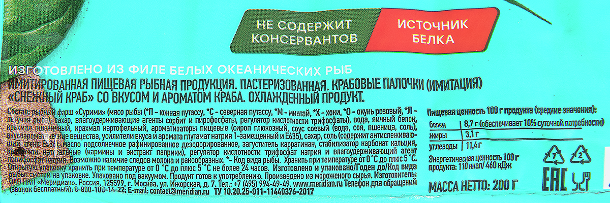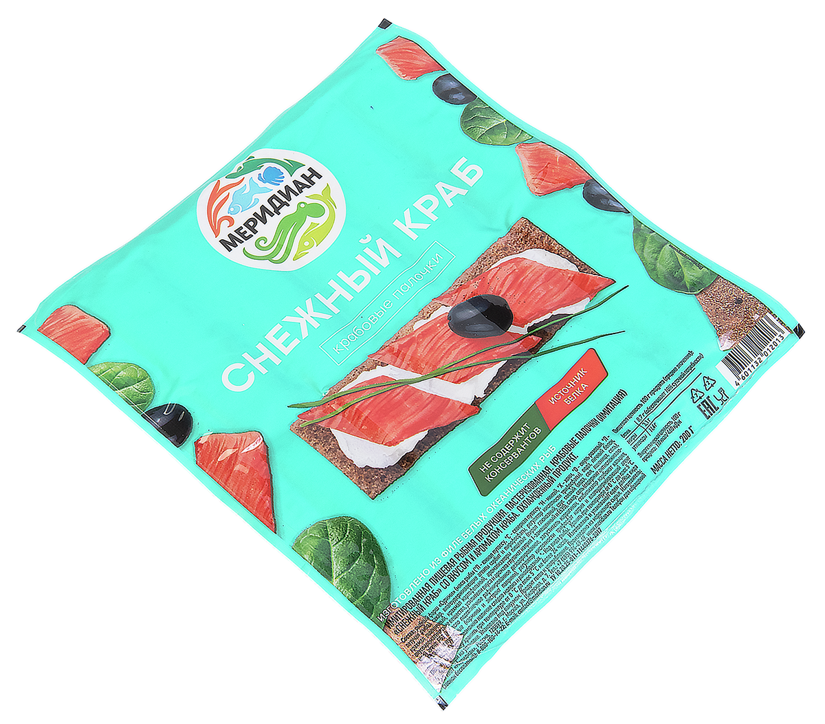 Крабовые палочки Меридиан Снежный краб , 200 г, – вкусная и ароматная закуска, изготовленная из натуральных отборных ингредиентов без ГМО и вредных красителей. Продукт подходит и для употребления в чистом виде в качестве быстрого перекуса в дороге или в офисе, и для добавления в салаты, выпечку или супы. Нежное и сочное мясо приготовлено на основе рыбного фарша. Закуска выполнена в виде рулетиков, которые имеют однородный цвет и плотность.
