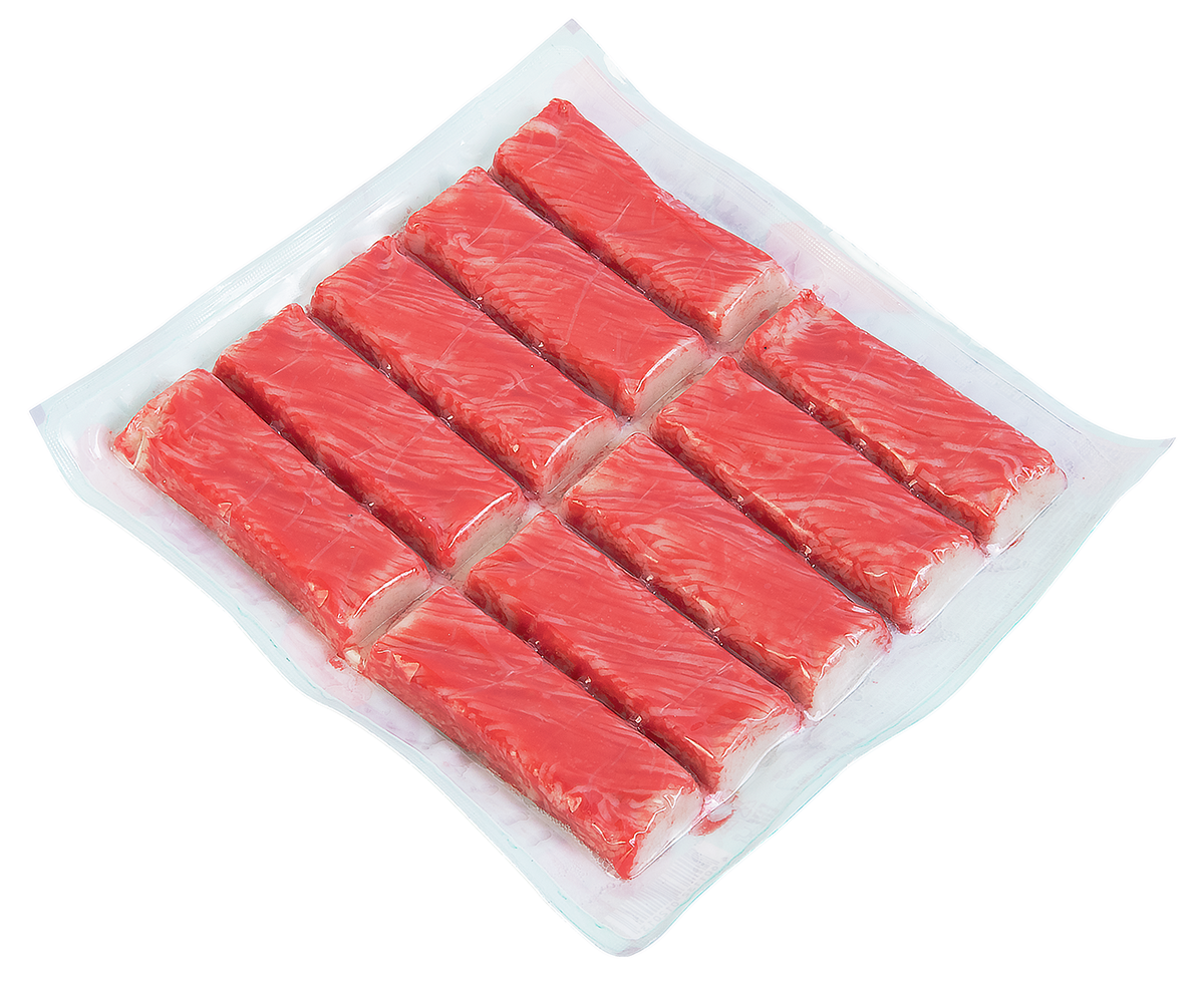 Фарш рыбный сурими, вода, крахмал, масло растительное, сахар, соль, яичный белок, пищевые добавки: ароматизатор идентичный натуральному крабовый, усилитель вкуса и аромата: Е621, Е627, Е631, загуститель Е407, красители Е120, Е160, Е182.