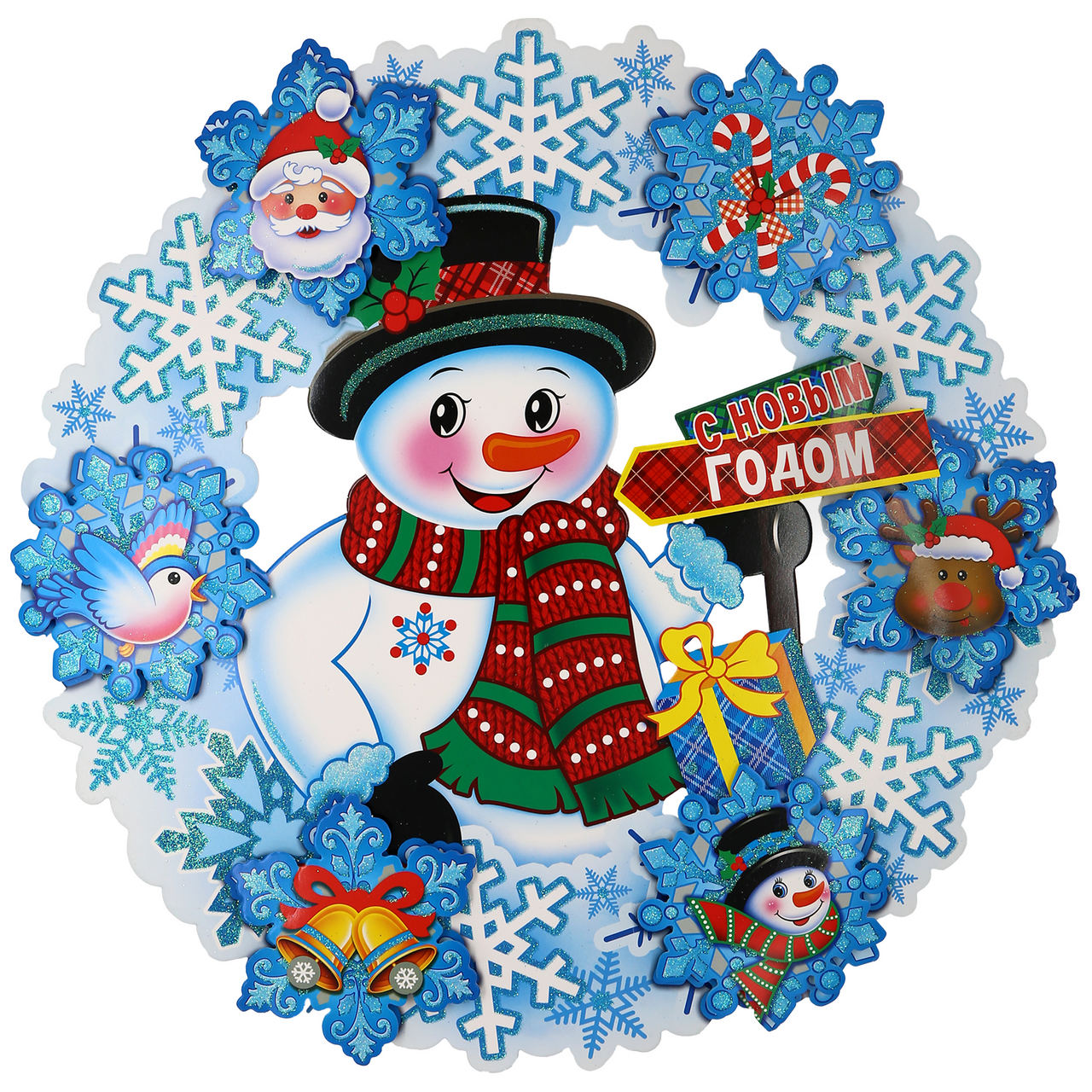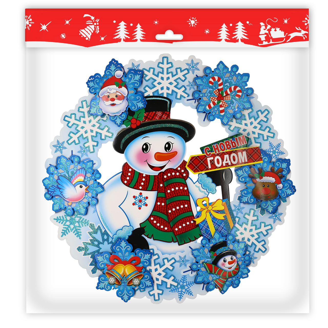 Панно-наклейка бумажное "Снеговик в снежинках". Размер с упаковкой: 39 х 39 см. Материал: Бумага