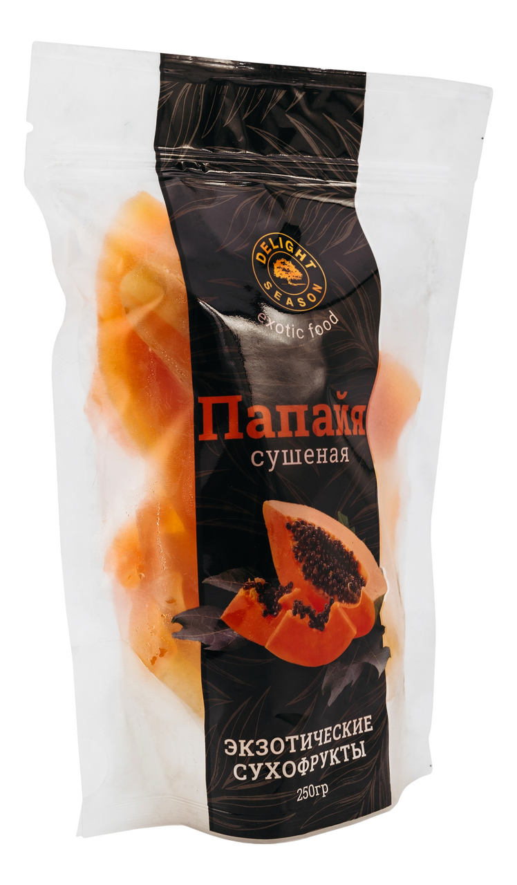 Папайя сушеная, 250г представляет собой сытный и полезный продукт. Его хорошо использовать для быстрого перекуса как самостоятельное блюдо или со всеми видами чая или кофе. Экзотический фрукт эффективно борется с голодом и дарит чувство насыщения. Яркие аппетитные кусочки папайи добавляют в освежающие и питательные смузи, творожные десерты к завтраку или полднику, йогурты, куличи, кексы, пряники, пироги и для украшения выпечки. Их можно добавить в тайский острый салат. Для этого папайю нарезают на полоски, смешивают с креветками и приправляют смесью чеснока и черного перца. Фрукт содержит целый комплекс полезных макро- и микроэлементов (калия, кальция, магния, меди), витаминов группы В, которые положительно сказываются на состоянии нервной системы. Аскорбиновая кислота делает продукт отличным антиоксидантом, повышает иммунитет и улучшает настроение. Он содержит небольшое количество углеводов, поэтому ломтики стоит включить в ежедневный рацион. Он укрепляет сосуды, борется с анемией, укрепляет костную ткань. Небольшую упаковку удобно взять с собой в поездку или на работу.