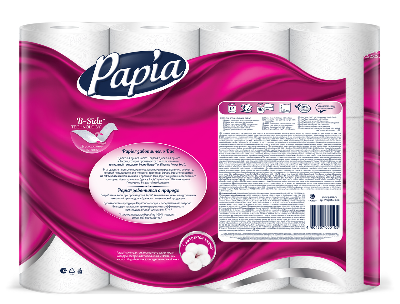 Уникальная технология B-Side позволяет наносить тиснение с обеих сторон, что делает бумагу мягкой, словно хлопок. Белые листы легко отрываются по линии перфорации, размер каждого 9.5х12см, всего в рулоне 140 листов, общая длина 16.8м. Дерматологически протестирована и одобрена независимым исследовательским институтом Dermatest (Германия). Обладает удивительной мягкостью и отличными впитывающими свойствами. Она хорошо перфорирована, не расслаивается и не рвется при намокании, а также не вызывает аллергии и не имеет запаха. Изготовленная из 100% первичной целлюлозы, она быстро растворяется в воде и не засоряет трубы. Бумага Papia обеспечит максимальный комфорт и подарит ощущение чистоты и свежести.