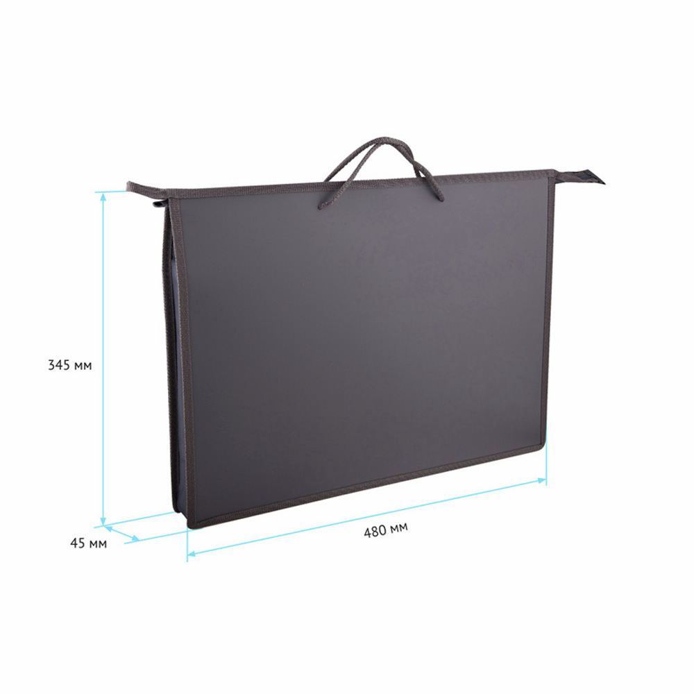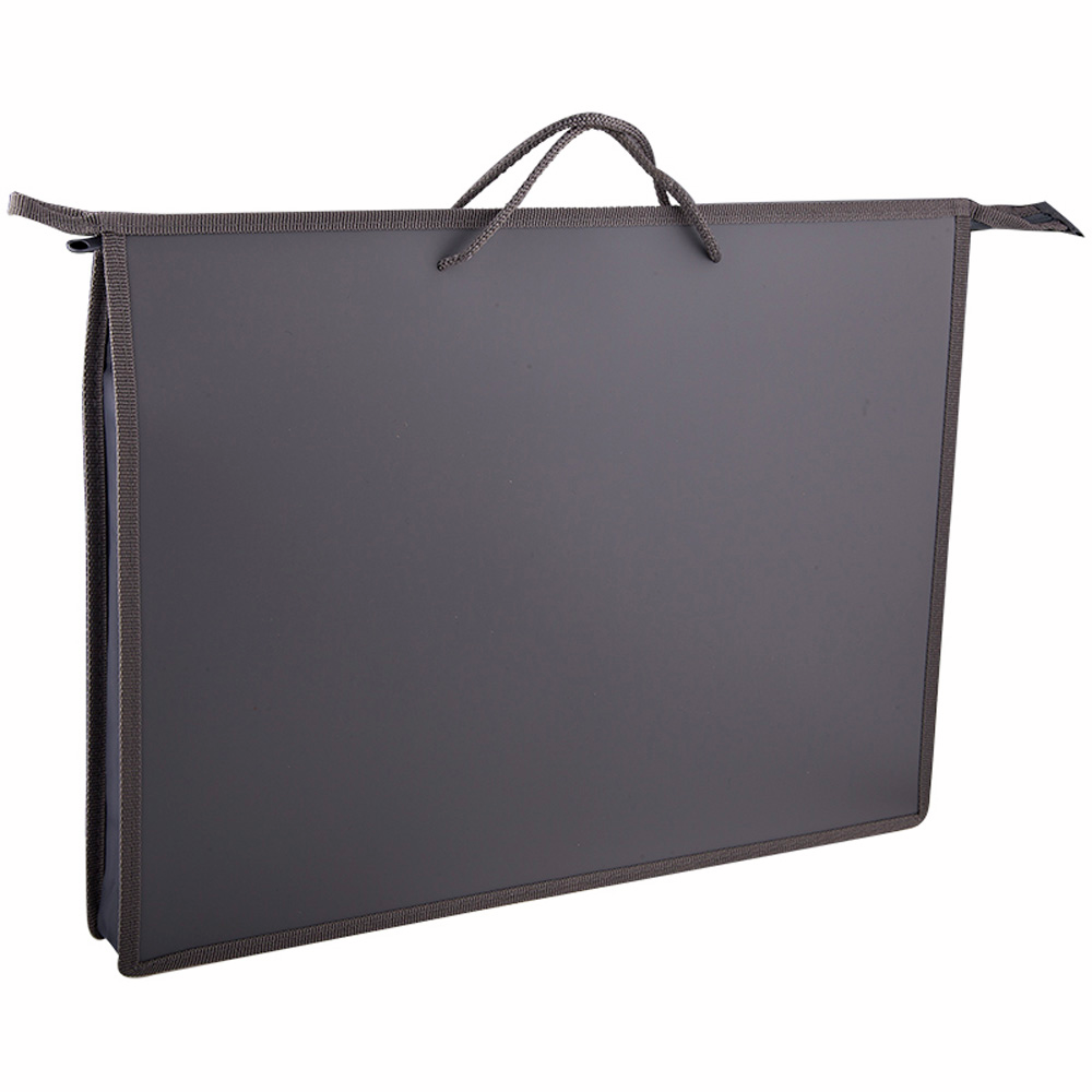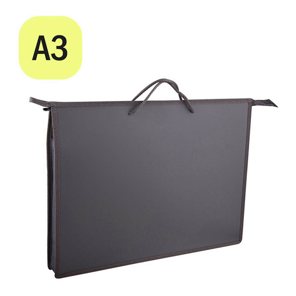 Папка с одним отделением для рисунков и чертежей формата А3. Изделие с ручками, что облегчает его переноску. Молния прочно фиксирует содержимое внутри папки, а серый цвет придаёт изделию строгости.