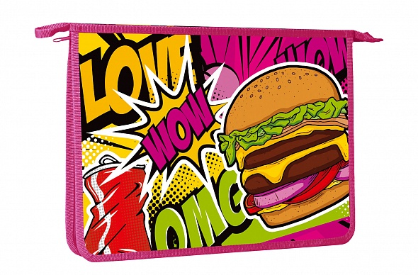 Выполнена из пластика, по краям имеет тканевую окантовку. Одно отделение. Застежка-молния расположена по верхнему краю папки.