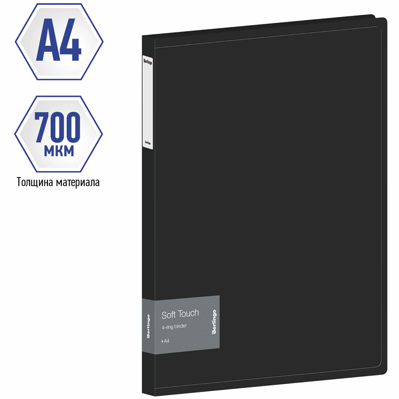 Папка Berlingo Soft Touch на 4 кольцах 700мкм, 40мм - стильный аксессуар для офиса и учёбы с плотной обложкой с приятной софт-тач фактурой. Изготовлена из высококачественного полипропилена толщиной 700 мкм с особой фактурой с эффектом софт-тач. Папка оснащена стильными черными кольцами, которые крепятся на заднюю стенку. Специальная D-форма колец диаметром 20мм помогает удобно и ровно хранить документы, которые могут быть выровнены по левому краю, благодаря боковой вертикальной стенке кольца. Специальные формовые отверстия в обложке служат для надежного защелкивания папки в сложенном виде, предотвращают случайное открытие обложки и замятие документов внутри при хранении и транспортировке. На внутренней стороне обложки папка оснащена плотным прозрачным карманом для удобного хранения мелочей: ручки, заметок, визиток, дисков, флешек и др. Корешок папки оклеен специальным стикером для подписи содержимого, что позволяет легко и удобно организовывать документы на полке.