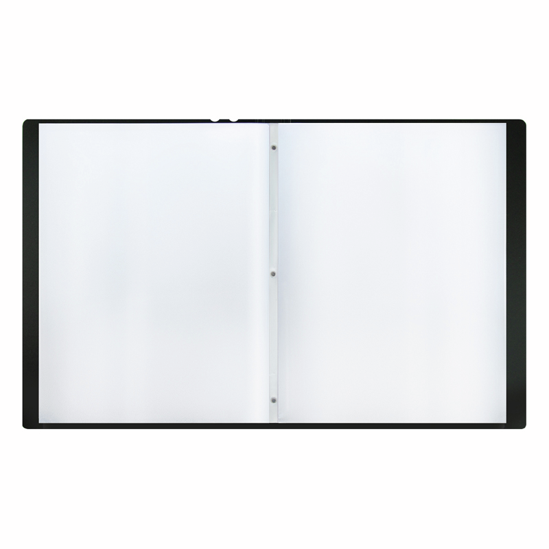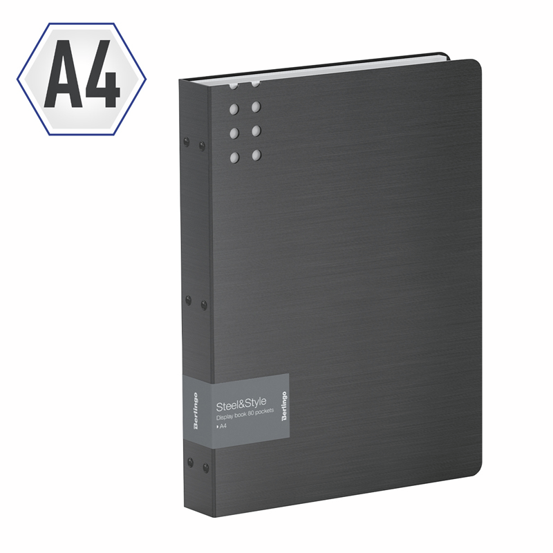 Функциональный и стильный помощник для хранения документов. Выполнена в насыщенном чёрном цвете в сочетании с фактурой "сталь". Увеличенная толщина обложки - 1800 мкм. Ширина корешка - 45 мм. Тип скрепления - металлические клёпки. Папка изготовлена из полифома. Декоративные круговые вырубки на крышке позволяют легко закрепить ручку на папке. Внутренняя сторона обложки имеет чёрный цвет. Она имеет 80 прозрачных ли��тов-карманов увеличенной толщины 40 мкм, надёжно скреплённых металлическими клёпками. Индивидуальная упаковка в пакет с липким краем.