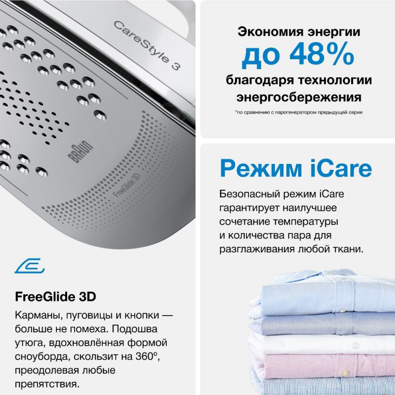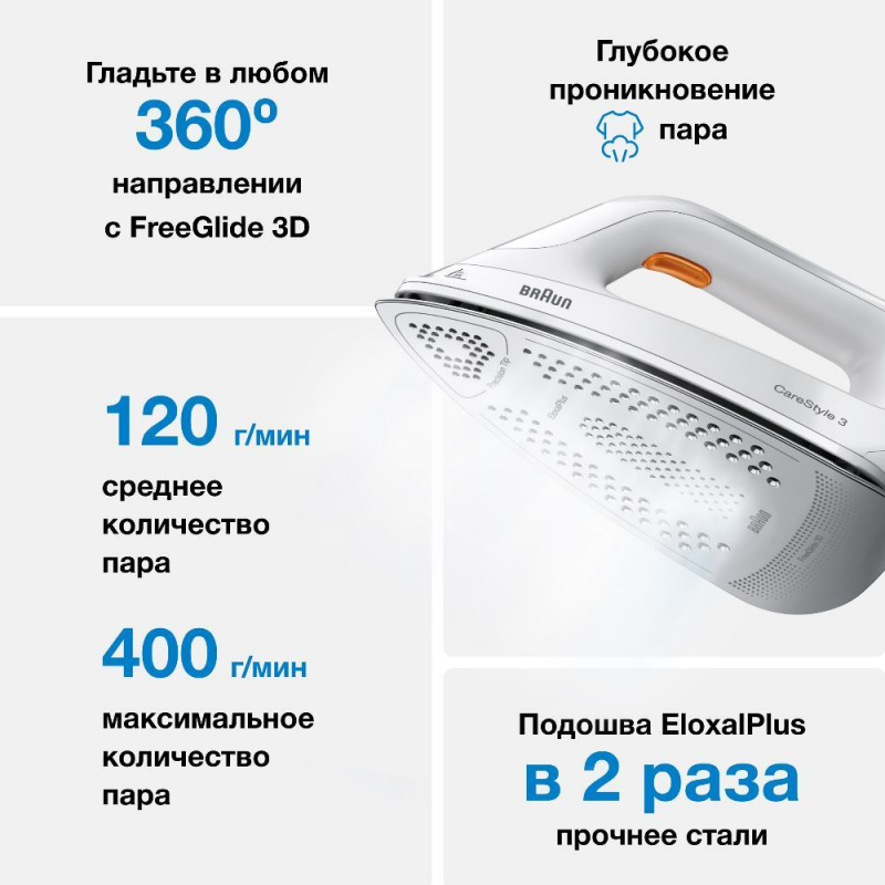 Парогенератор Braun IS3132WH – компактный прибор, оснащенный новым 2-литровым резервуаром XXL, который позволяет гладить до 2,5 часов не останавливаясь. Он значительно меньше и легче аналогичных моделей, при этом в разы мощнее многих устройств. Вы экономите 50% времени на то, что действительно важно, благодаря уникальной комбинации технологий FreeGlide 3D и DoubleSteam, которая является стандартной для всей линейки CareStyle. Кроме того, есть новая инновационная с��стема Easy CalcClean, которая удаляет накипь всего за две минуты.