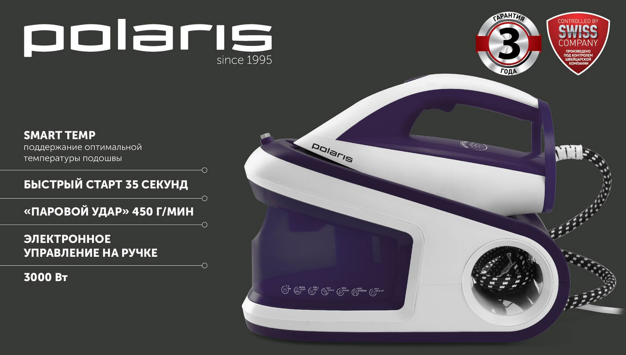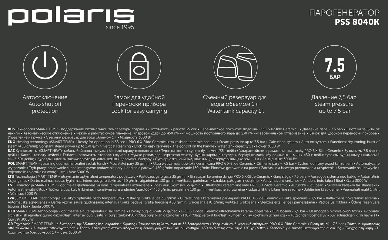 Технология Smart Temp - поддержание оптимальной температуры подошвы. Можно гладить любые ткани без риска испортить материал. Время подготовки к работе: 35 секунд. Электронное управление на ручке. Мощность 3000Вт. Мощность постоянного пара 130г/мин. Мощность парового удара 450г/мин. Съемный резервуар для воды 1л. Давление 7,5 бар. Электронное управление на ручке. Автоотключение. Удобный замок для переноски. Удобная фиксация парового шланга и шнура на базе. Гарантия 3 года. Оснащен системой постоянной подачи пара 130г/мин и паровым ударом с интенсивностью 450г/мин, что обеспечивает тщательное разглаживание стойких складок на разных тканях. Съемный резервуар вмещает до 1л воды. Технология Smart Temp поддерживает температуру и снижает риск повреждения ткани в процессе глажки. Подошва с керамическим покрытием Pro 5 Ceramic обеспечивает легкое перемещение утюга. Она устойчива к царапинам и отличается простотой в очистке. На ручке парогенератора Polaris PSS 8040K расположена электронная панель управления с индикаторами. Замок на базе повышает комфорт переноски и хранения прибора.