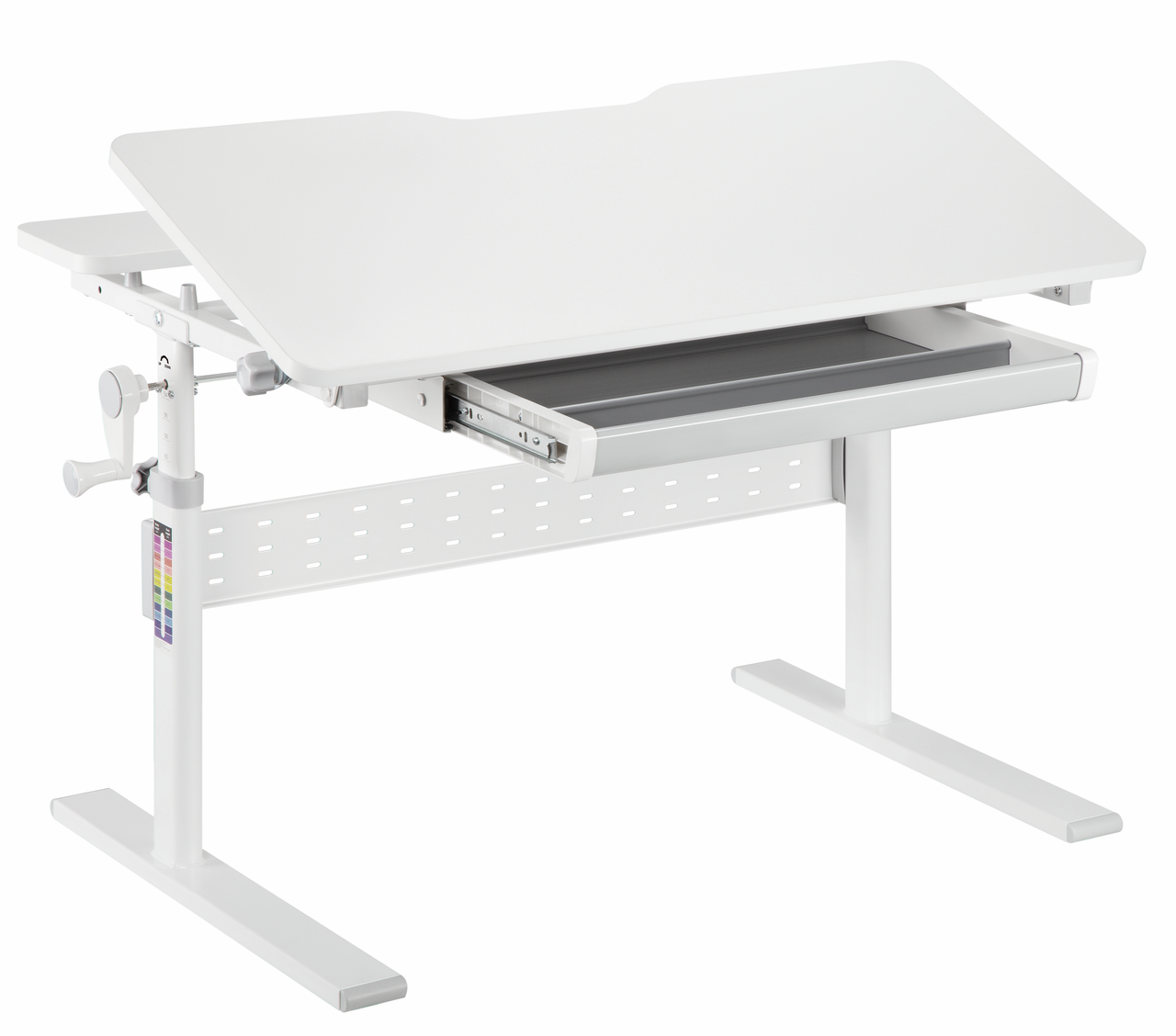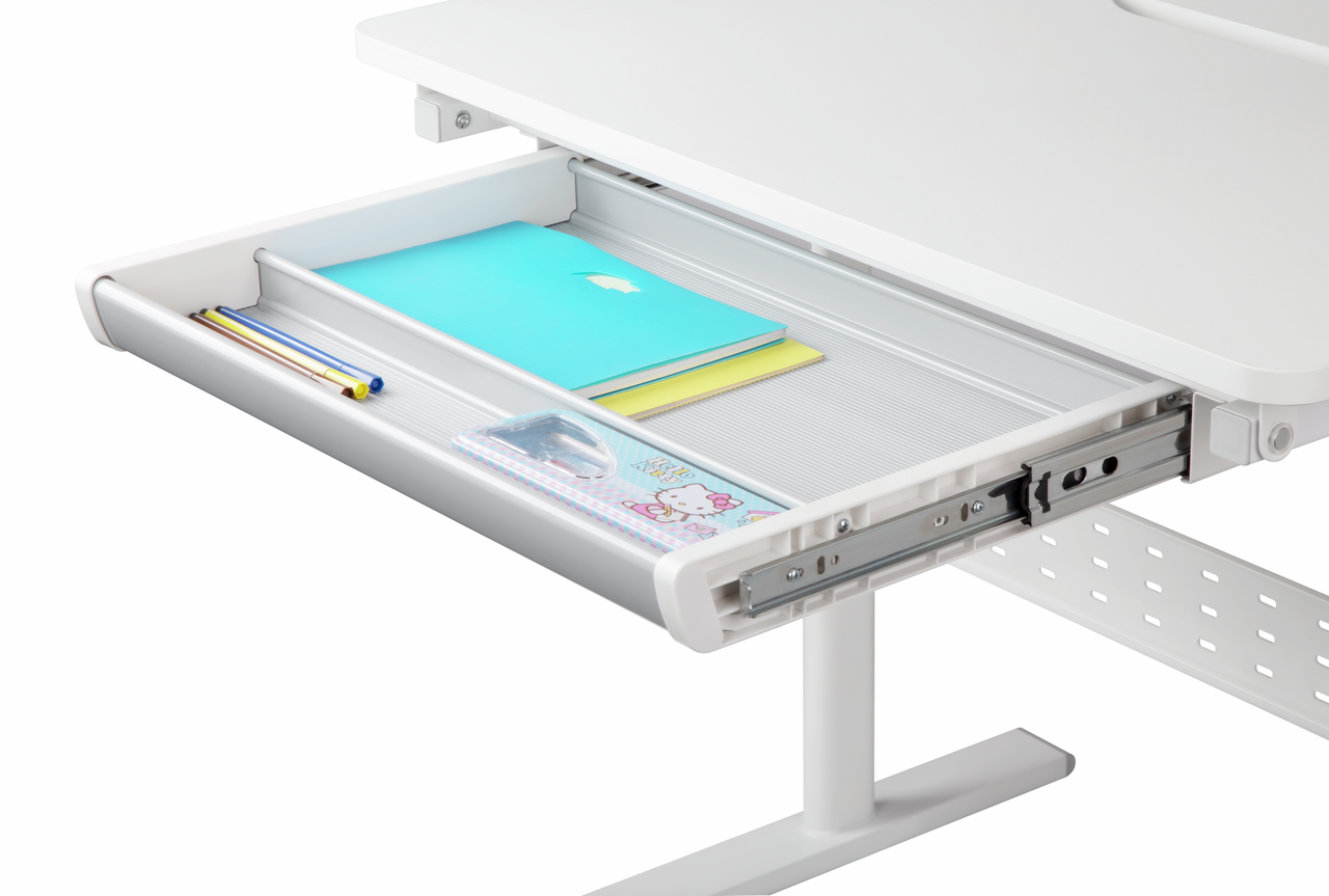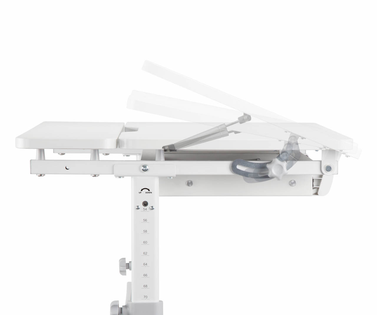 Парта регулируемая белая - преимущества стола-трансформера E601: регулировка высоты под рост ребенка; регулировка угла наклона столешницы для удобного чтения и рисования; вместительный пенал для канцелярских принадлежностей, книг и тетрадей; защита от защемлений; крючок для рюкзака или сумки; меламиновое покрытие стола.