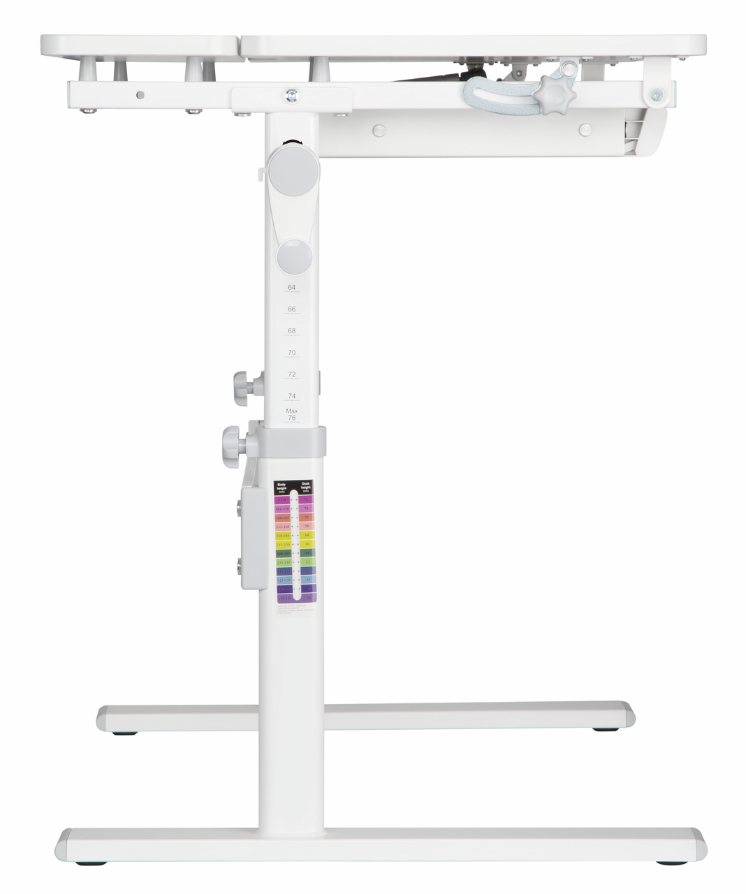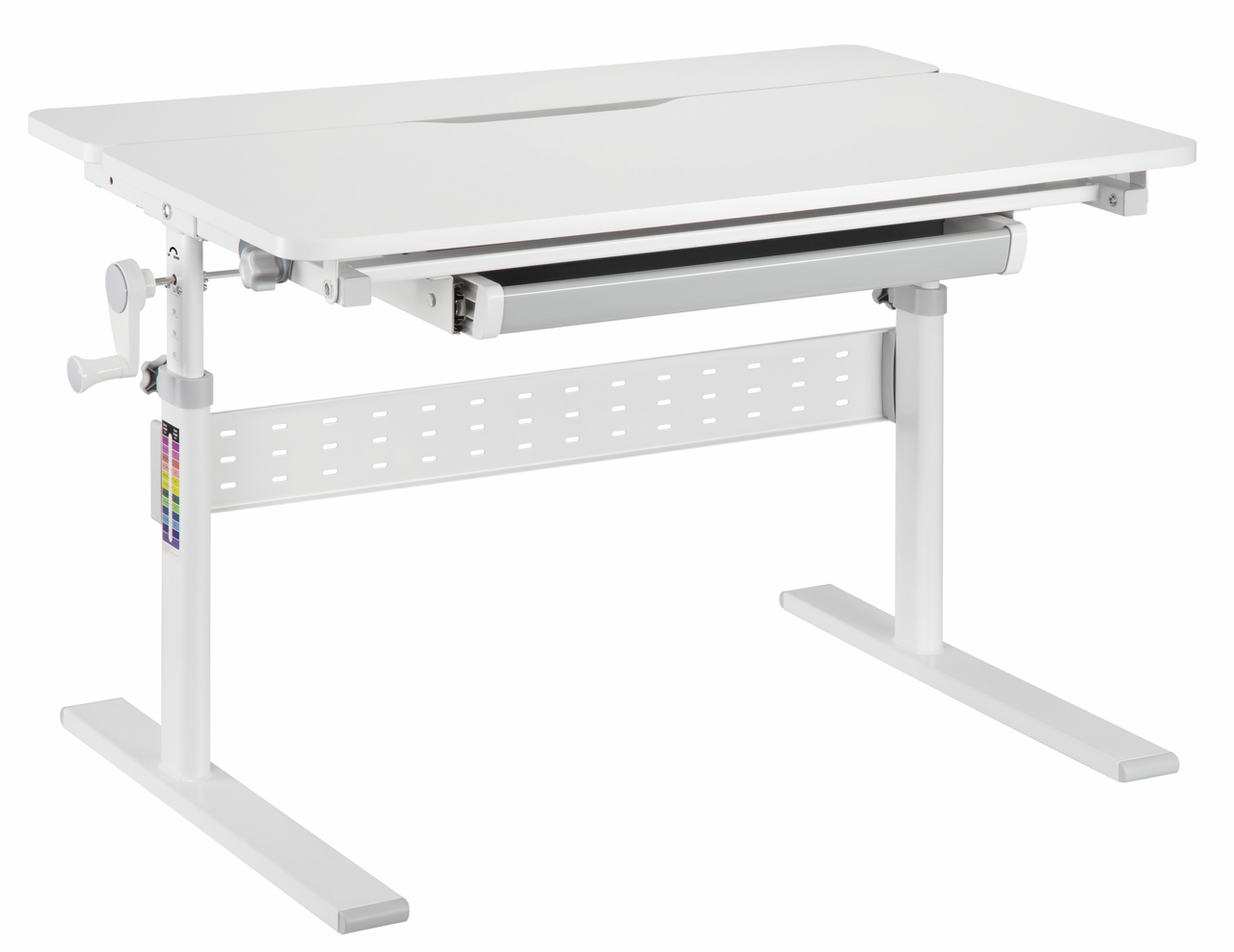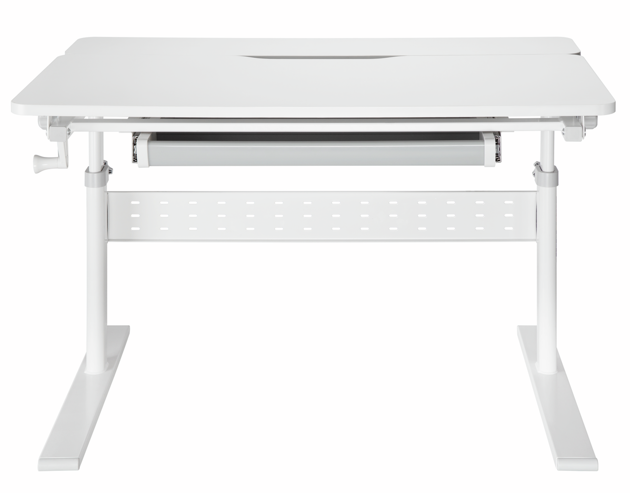 Парта регулируемая белая - преимущества стола-трансформера E601: регулировка высоты под рост ребенка; регулировка угла наклона столешницы для удобного чтения и рисования; вместительный пенал для канцелярских принадлежностей, книг и тетрадей; защита от защемлений; крючок для рюкзака или сумки; меламиновое покрытие стола.