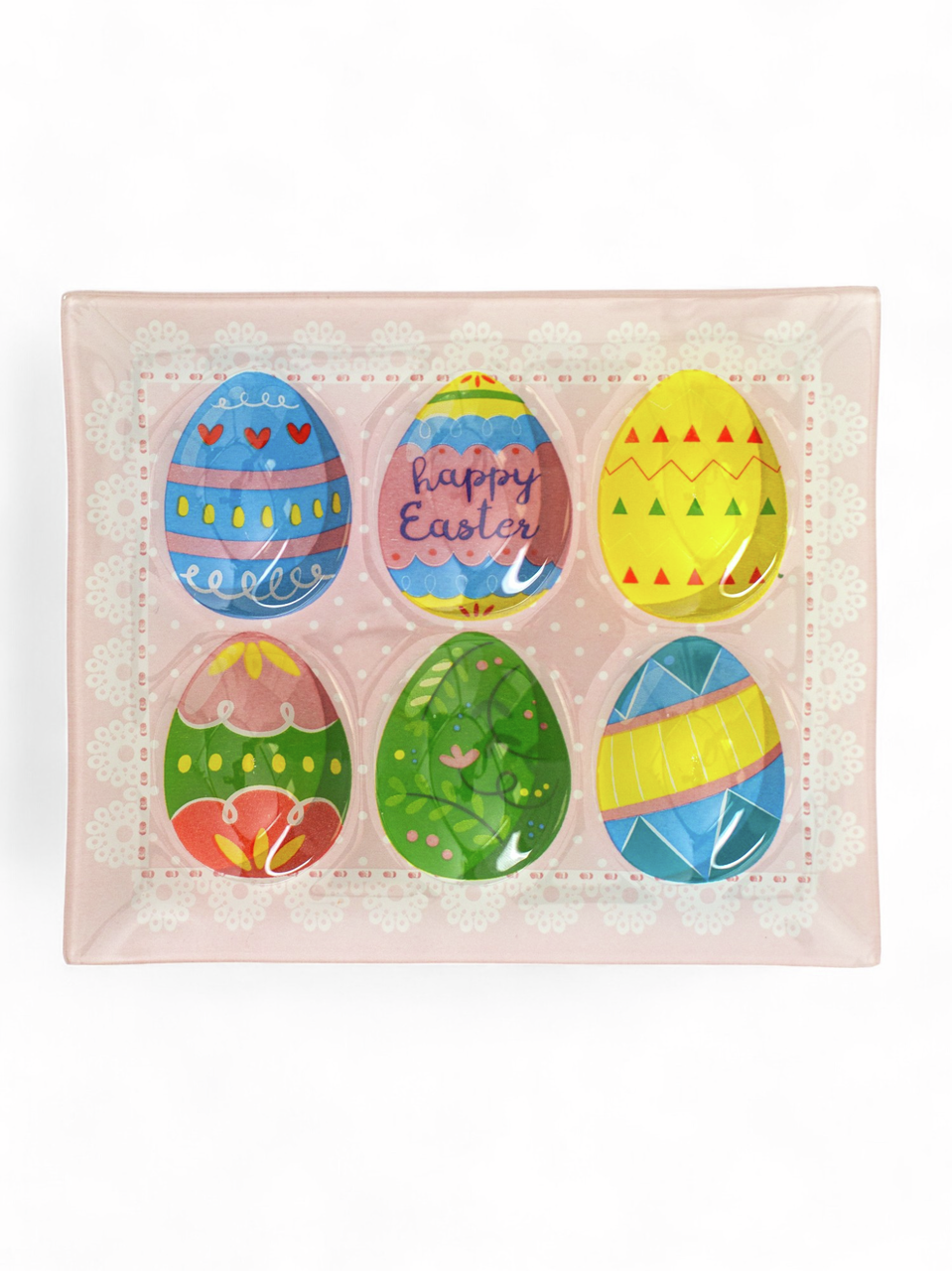 Тарелка пасхальная для 6 яиц. Очаровательная пасхальная тарелка с выемками для 6-ти яиц. В центре - место для установки кулича или творожной пасхи. Изготовлена из стекла и украшена великолепным декором. Такая посуда, несомненно, украсит праздничный Пасхальный стол.