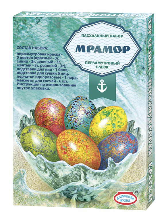 Пасхальный набор Перламутровый блеск помогает существенно сократить время, необходимое для окрашивания яиц в разноцветные тона перед праздником. Технология отличается простотой: в наборе содержится 6 ампул с красителями по 3 г, каждую из которых необходимо развести в горячей воде. Перед работой рекомендуется надеть перчатки, предусмотренные в комплекте. Колеры следует наносить на чистые отваренные яйца, которые еще не остыли, потому что краска на теплую скорлупу ложится качественнее, чем на холодную. От ампулы следует отрезать кончик, на обе перчатки капнуть каплю и растереть ее. Яйцо берется в руки и натирается окрашенной поверхностью. Если капнуть разноцветные краски, то получатся интересные цветовые сочетания, переливы и прожилки, похожие на мрамор.