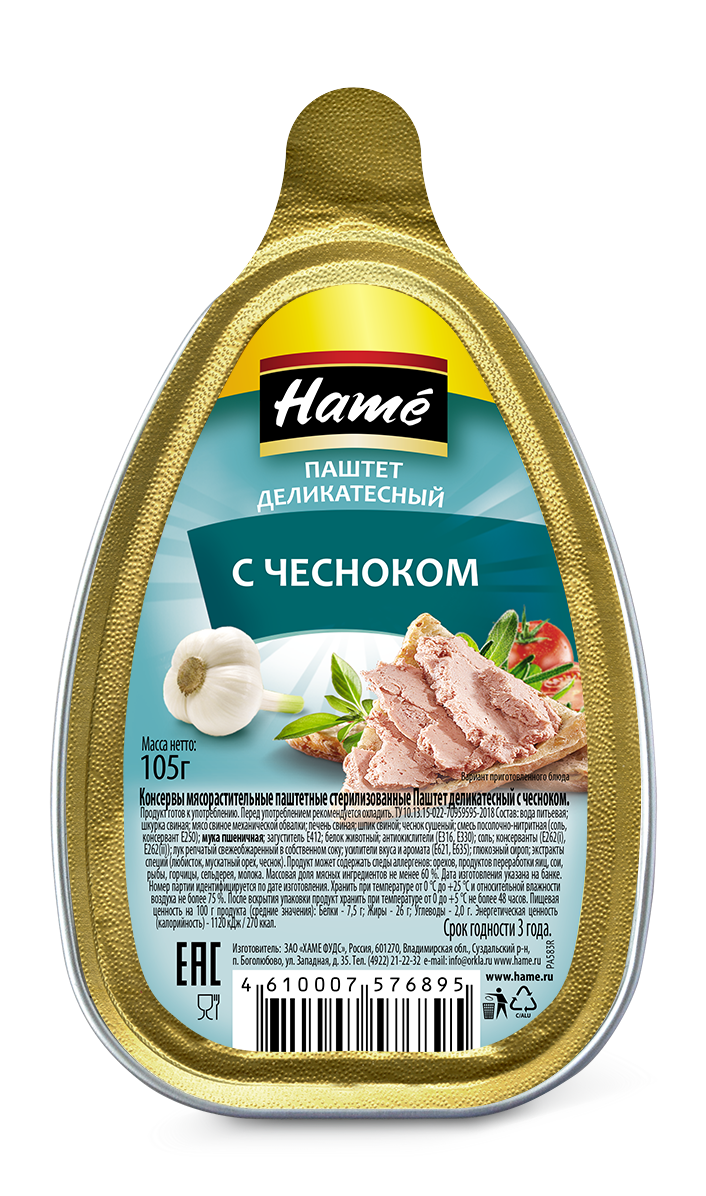 Классический свиной паштет с чесноком в современной алюминиевой упаковке. Отлично подходит для семейного завтрака, перекуса в течение дня дома, на работе или в поездке, а также в качестве быстрой закуски для внезапных гостей. Также хорошо подходит как дополнение к горячему супу. Достаточно открыть баночку и сервировать со свежим хлебом, тостами или хлебцами на Ваш вкус.