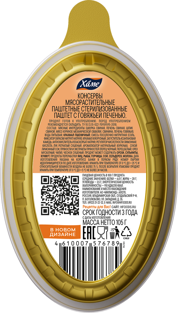 Мясные ингредиенты не менее 53% (шкурка свиная, печень свиная, шпик свиной, мясо куриное механической обвалки, свинина, печень говяжья), вода питьевая, крахмал пшеничный, смесь посолочно-нитритная (соль, фиксатор окраски нитрит натрия), крахмал кукурузный, загуститель ксантановая камедь, антиокислитель изоаскорбат натрия, регулятор кислотности лимонная кислота, лук репчатый сушеный, ароматизаторы натуральные (куркума, олеорезины: кориандра, мускатного ореха), сухой лимонный сок, натуральные специи (перец черный, чеснок, перец белый), экстракты пряностей (орех мускатный, чеснок, чили).