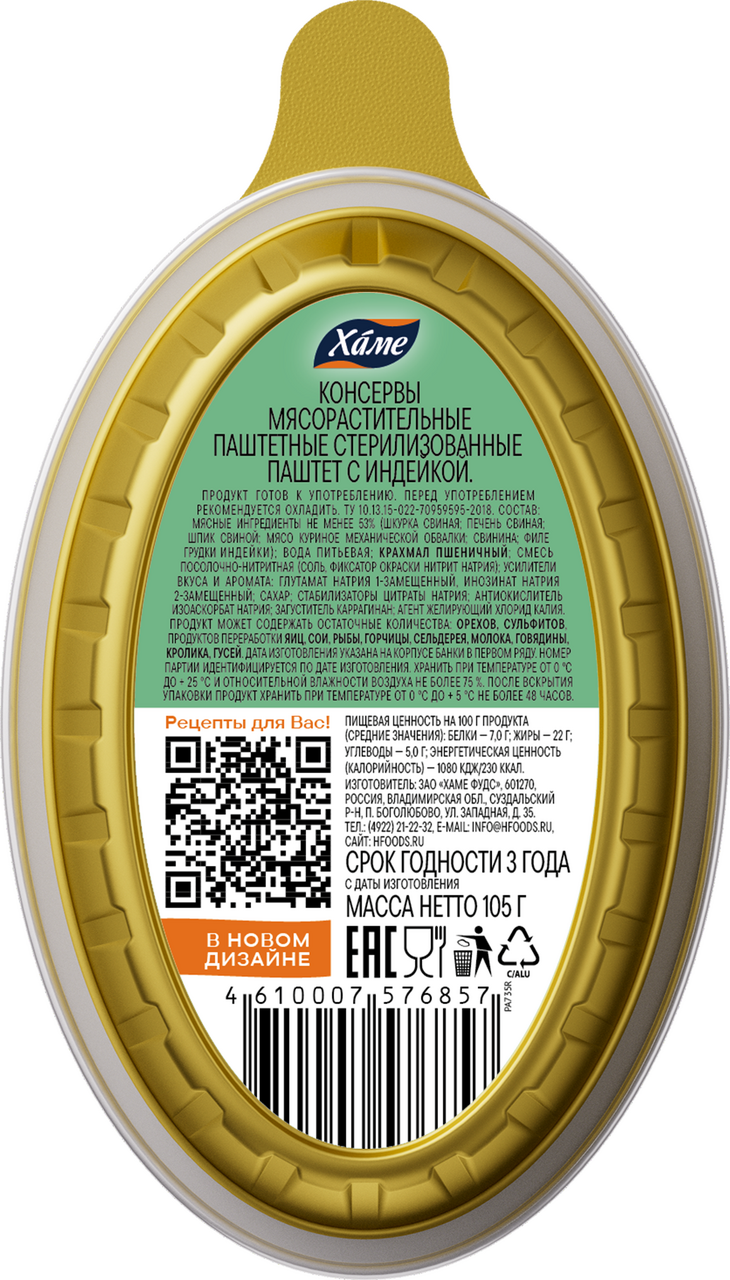 Классический свиной паштет с филе индейки в современной алюминиевой упаковке. Отлично подходит для семейного завтрака, перекуса в течение дня дома, на работе или в поездке, а также в качестве быстрой закуски для внезапных гостей. Достаточно открыть баночку и сервировать со свежим хлебом, тостами или хлебцами на Ваш вкус.