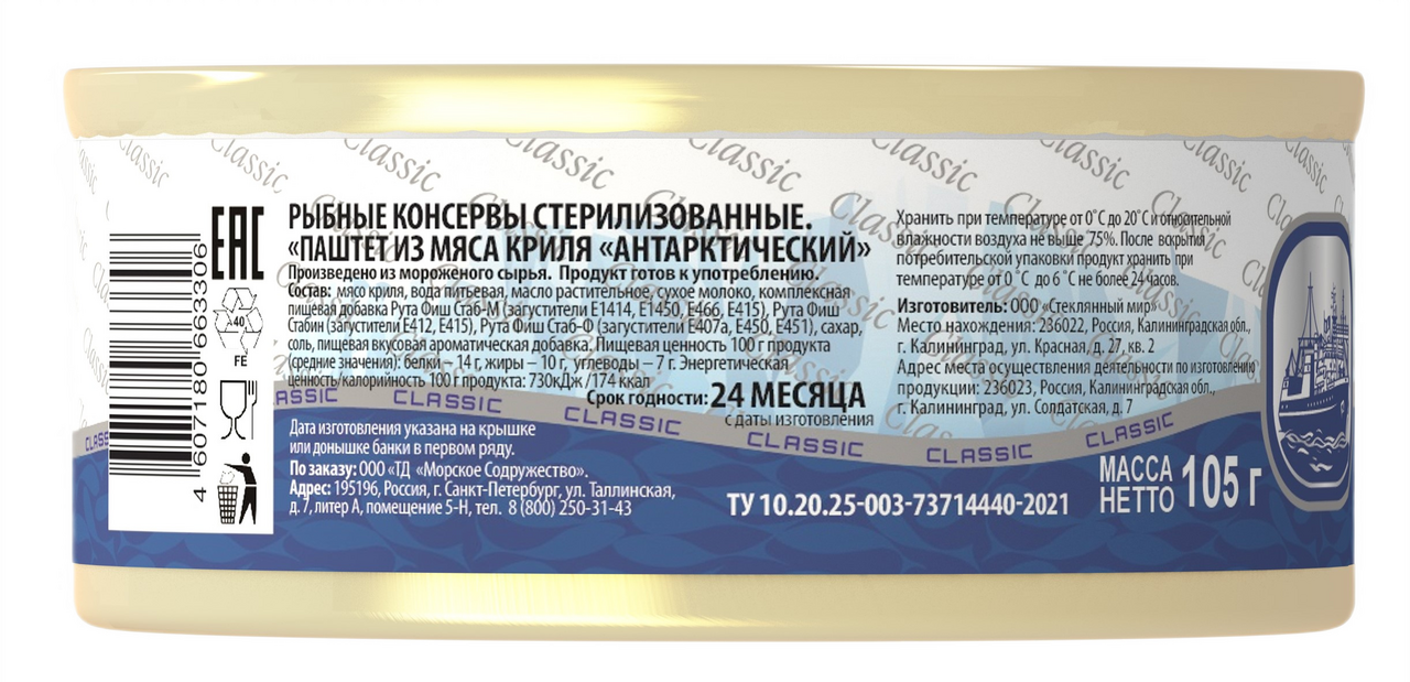 Мясо криля, вода питьевая, масло растительное, сухое молоко, комплексная пищевая добавка Рута Фиш Стаб-М (загустители Е1414, Е1450, Е466, Е415), Рута Фиш Стабин (загустители Е412, Е415), Рута Фиш Стаб-Ф (загустители Е407а, Е450, Е451), сахар, соль, пищевая вкусовая ароматическая добавка.