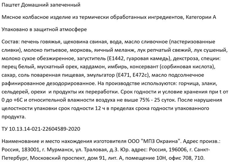 Печень говяжья, щековина свиная, вода, масло сливочное (пастеризованные сливки), молоко питьевое, морковь, яичный меланж, лук репчатый свежий, лук сушеный, молоко сухое обезжиренное, загуститель (Е1442, гуаровая камедь), декстроза, специи: перец белый, мускатный орех, кардамон, имбирь, консервант (сорбиновая кислота), сахар, соль поваренная пищевая, эмульгатор (Е471, Е472с), масло подсолнечное рафинированное дезодорированное.
