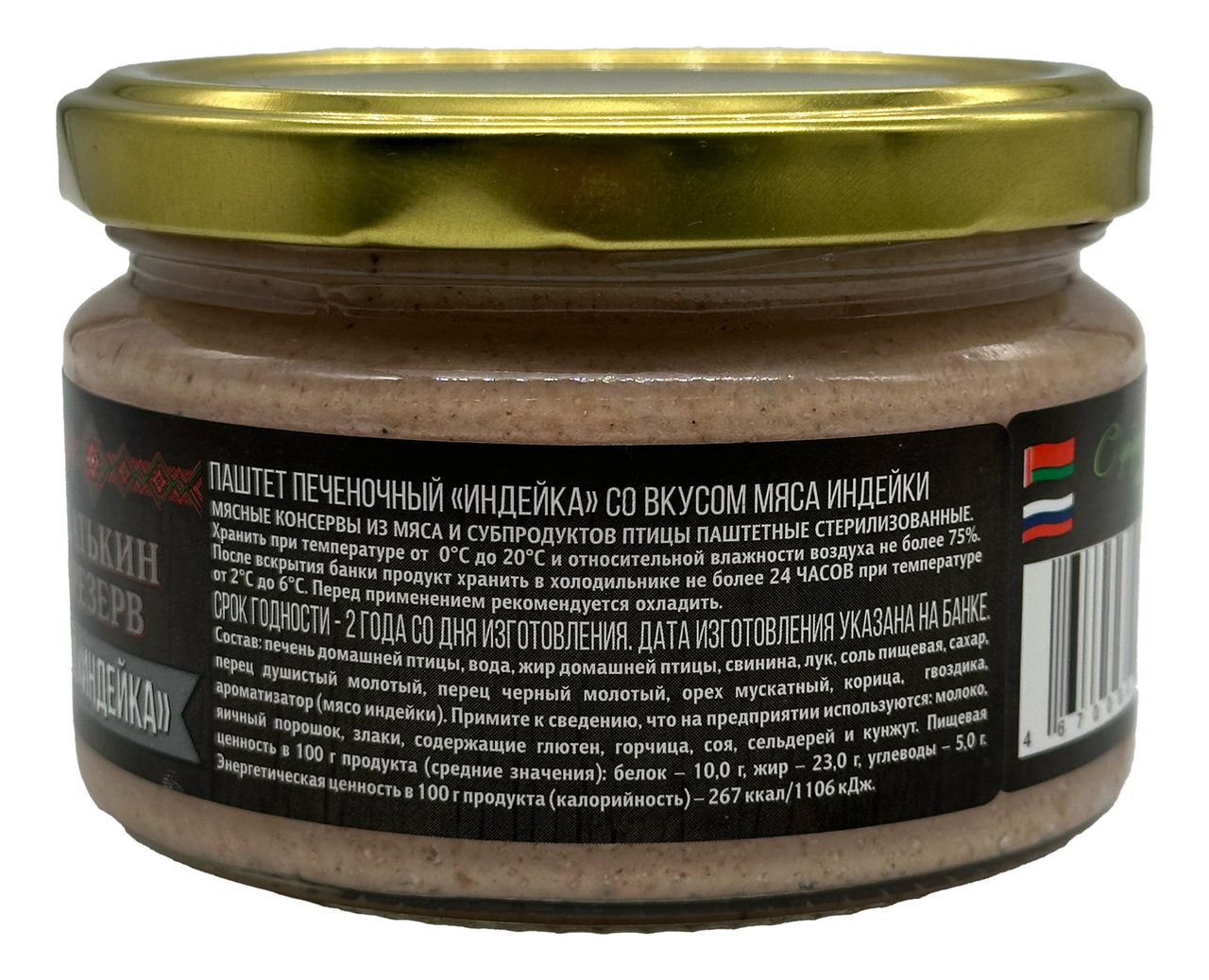 Паштет печеночный Индейка, это нежнейшая закуска из мяса печени и мяса индейки. Его можно подавать в качестве готового блюда: как в составе брускетты или салата, так и в составе второго блюда в виде картофеля, макарон или риса, приготовленных с мясным паштетом. Продукт подходит как для любителей активных видов отдыха: рыболовов, охотников, путешественников, туристов, так и дачников и домохозяек, а также тех, кто соблюдает правильное питание.
