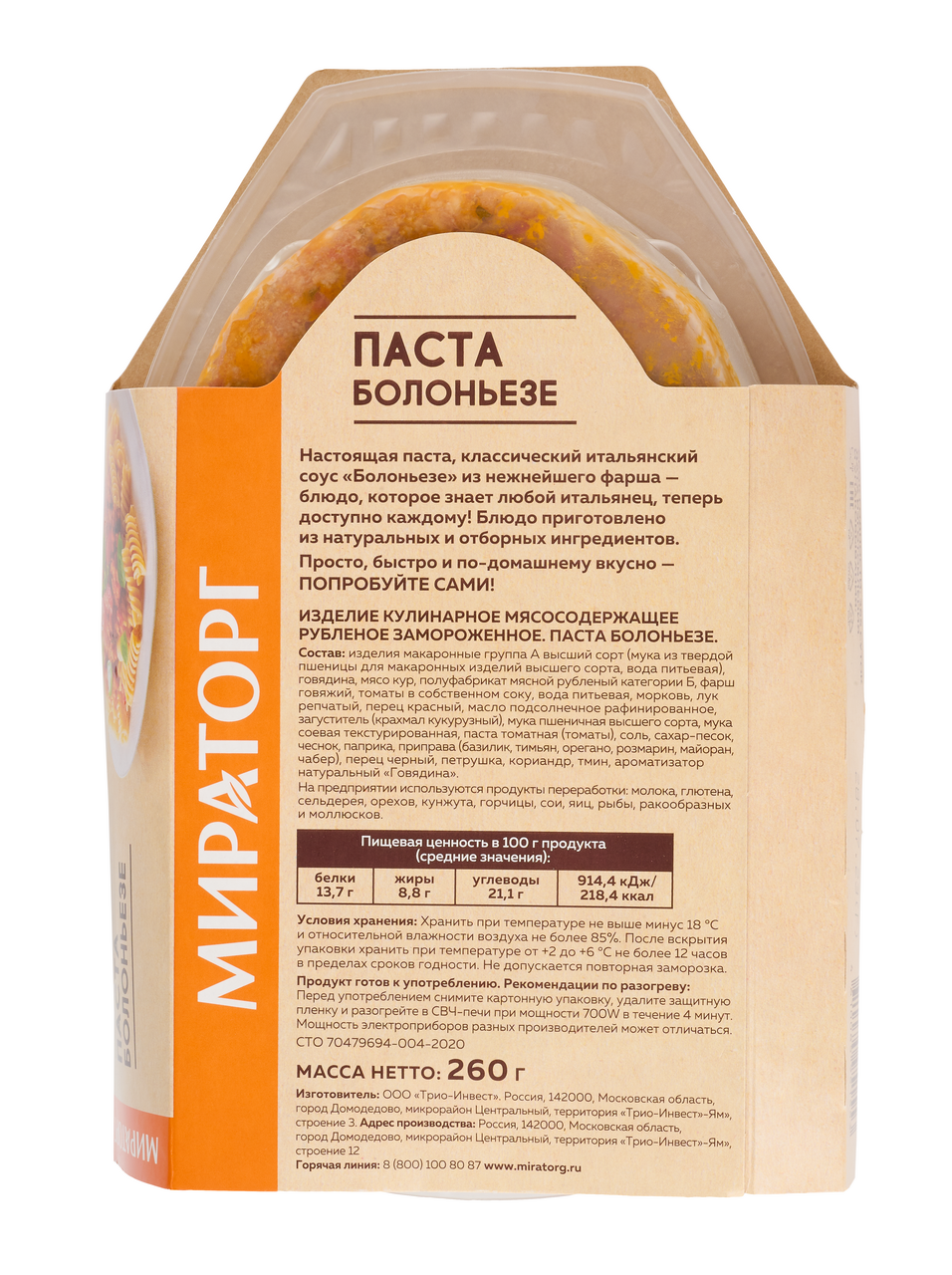 Паста со спелыми томатами и отборной говядиной Мираторг, приготовленная по классическим итальянским рецептам. Ее готовят из лучших натуральных компонентов. Домашний вкус и максимум витаминов. Поможет сэкономить силы и время на создании обеда или ужина. Это полностью готовый продукт, который необходимо разогреть в микроволновой печи, чтобы быстро получить питательное блюдо. Изделие производится из натуральных ингредиентов в соответствии с традиционным итальянским рецептом, что обеспечивает его непревзойденное качество. Сочетание соуса из томатов, овощей, кусочков мяса и специй с пастой придает блюду насыщенный вкус.