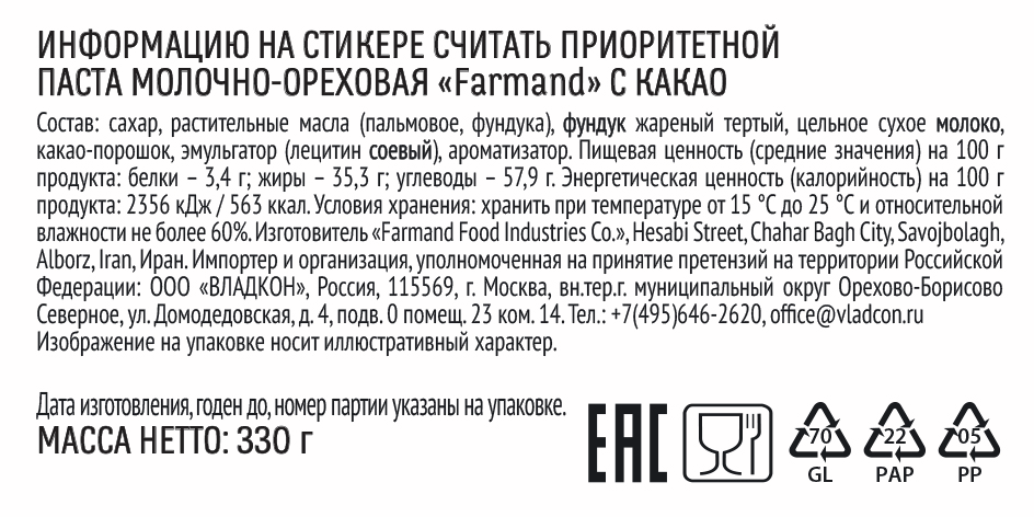 Сахар, растительные масла (пальмовое, фундука), фундук жареный тертый, цельное сухое молоко, какао-порошок, эмульгатор (лецитин соевый), ароматизатор.