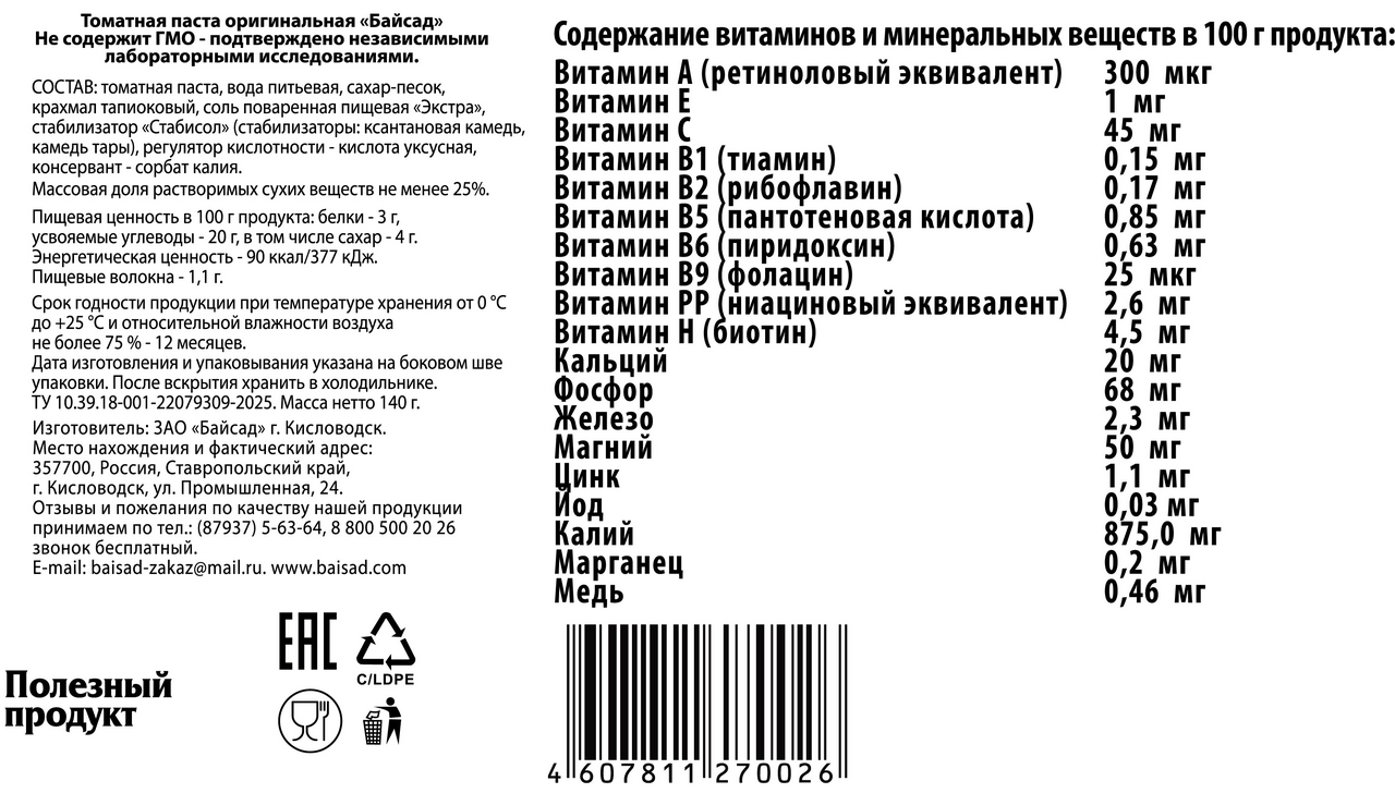 Томатная паста, вода питьевая, сахар-песок, крахмал тапиоковый, соль поваренная пищевая Экстра, стабилизатор Стабисол стабилизаторы: ксантановая камедь, камедь тары, регулятор кислотности - кислота уксусная, консервант - сорбат калия.