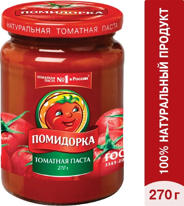 Томатная паста Помидорка – важный компонент первых блюд, соусов, заправок, оригинальных напитков. Она изготовлена из отборных спелых томатов по классической рецептуре, без добавления соли, пряностей и консервантов. Продукт обладает сбалансированным кисло-сладким вкусом, густой однородной консистенцией, насыщенным цветом. Он отличается высоким содержанием витамина С (37,5 мг в 100 г), бета-каротина, тиамина и ликоп��на, благодаря чему оказывает общеукрепляющее и антиоксидантное действие на организм.