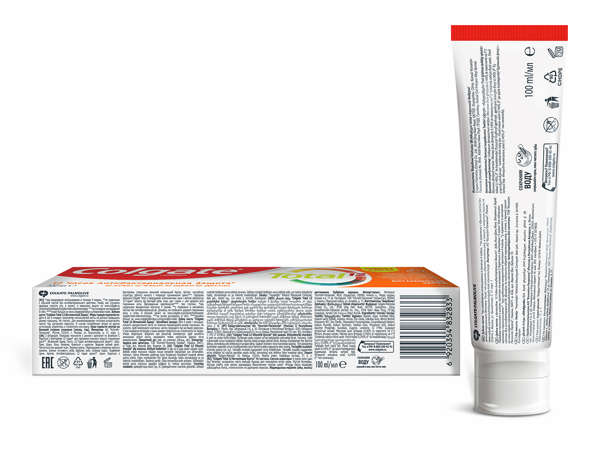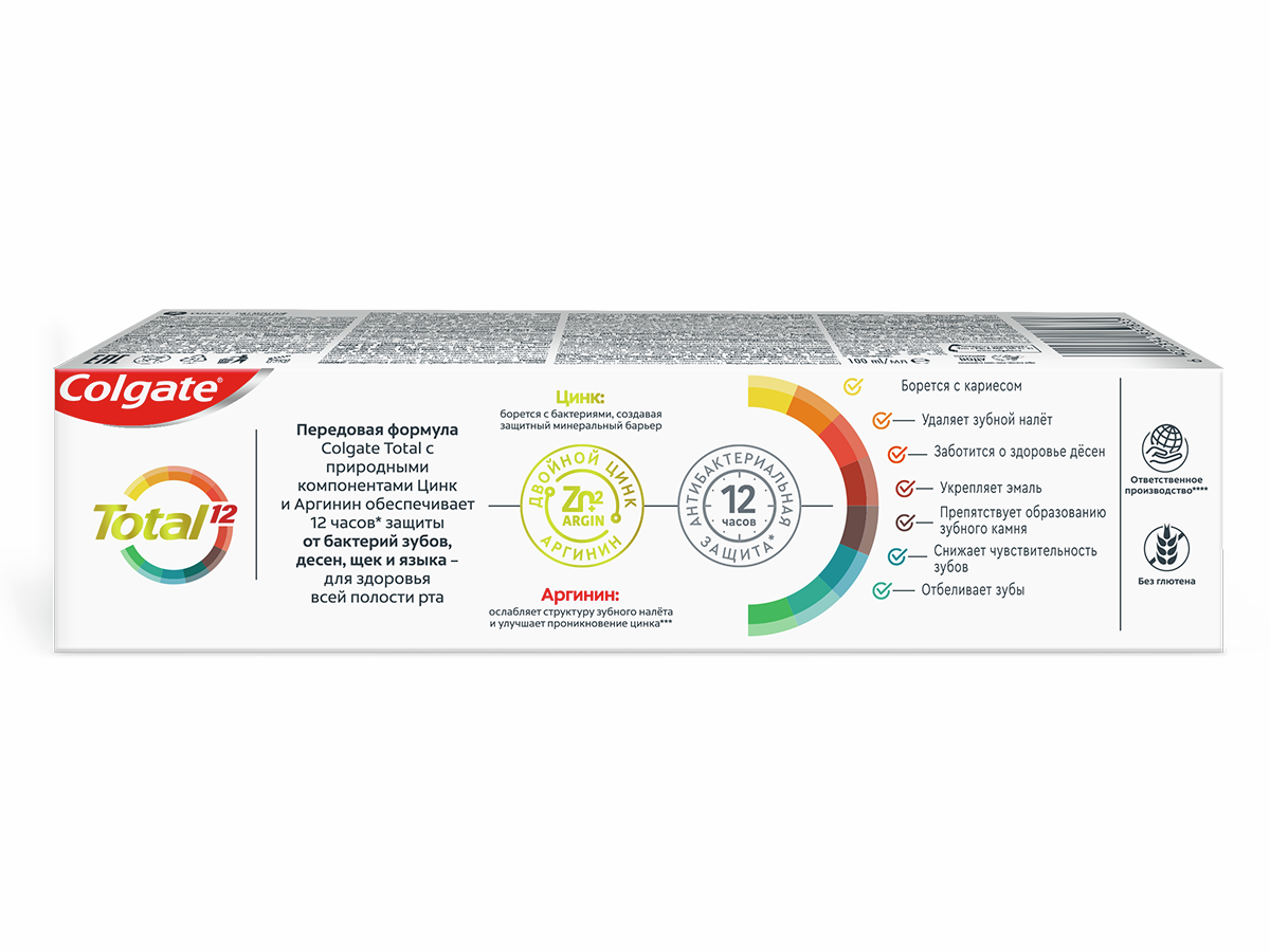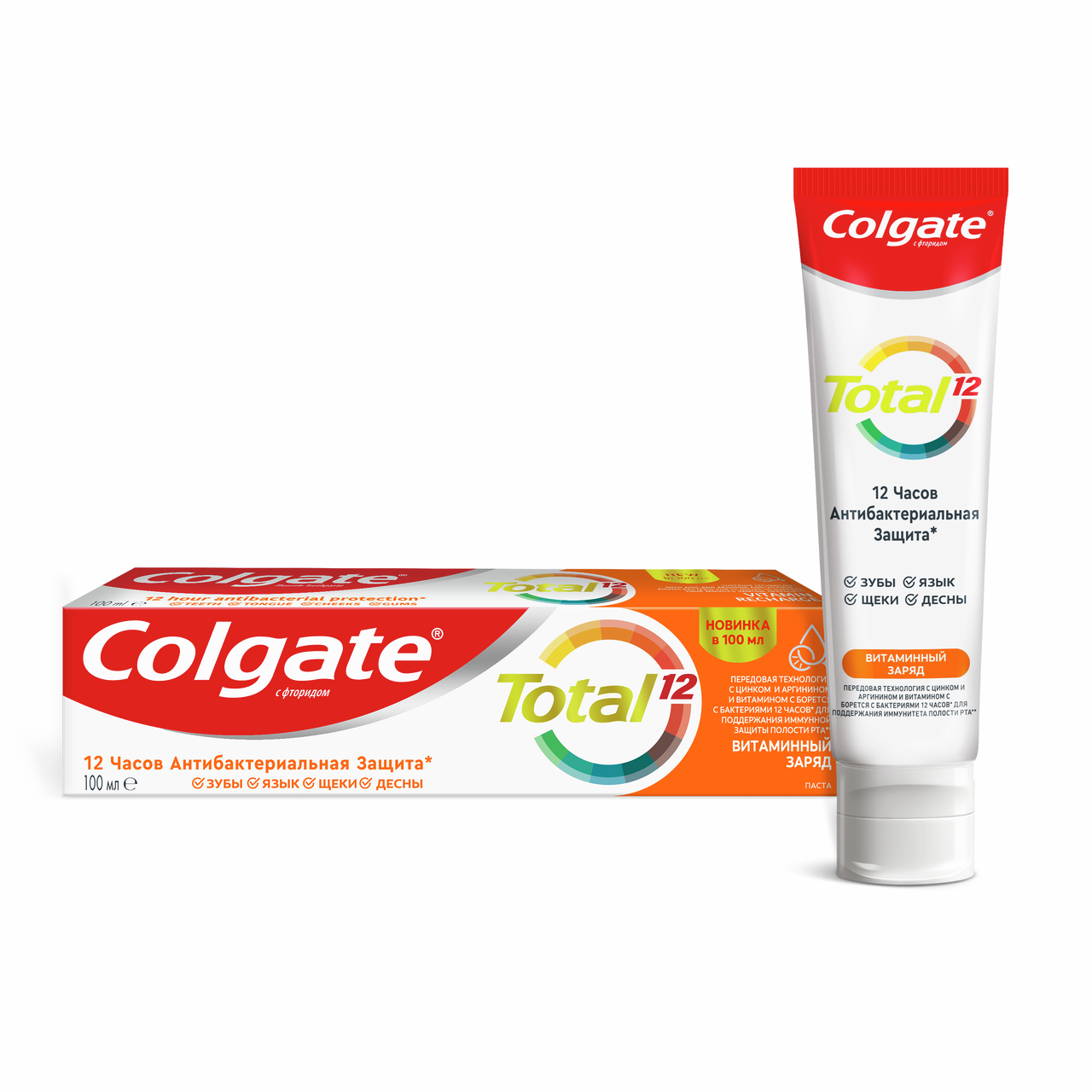 Доверьте здоровье своей улыбки новой зубной пасте Colgate Total 12 Витаминный Заряд! Передовая формула с цинком и аргинином, усиленная витамином С борется с бактериями 12 часов для поддержания иммунной защиты полости рта. Для обеспечения здоровья всей полости рта необходима комплексная защита, а не только забота о зубах. Поэтому Colgate Total 12 Витаминный Заряд проактивно борется с бактериями не только на зубах, но и на языке, щеках и деснах в течение 12 часов, обеспечивая здоровье всей полости рта. Почувствуйте разницу с уверенной, яркой и здоровой улыбкой!