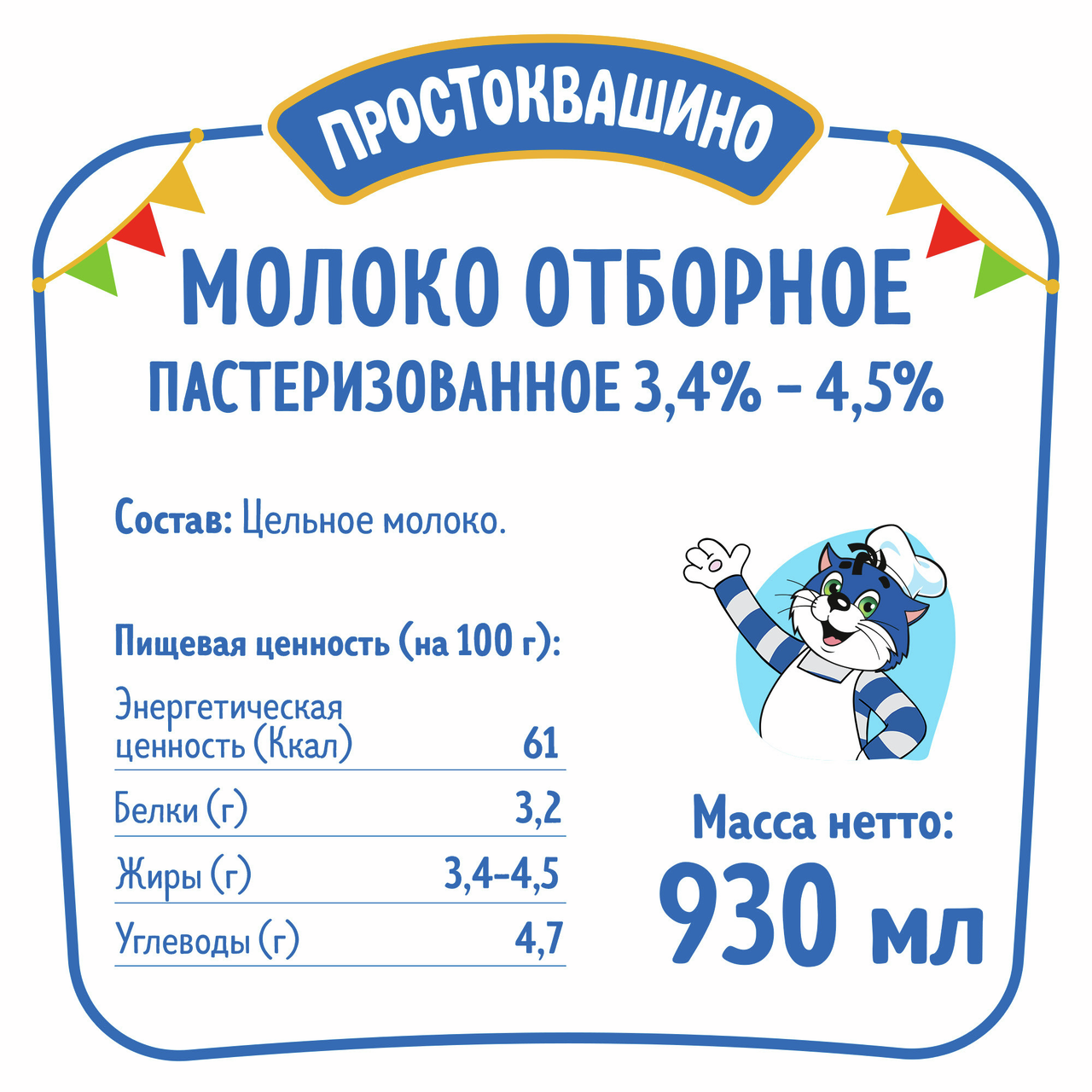 Молоко Простоквашино отборное пастеризованное 3.4%-4.5%, 930мл x 6 шт