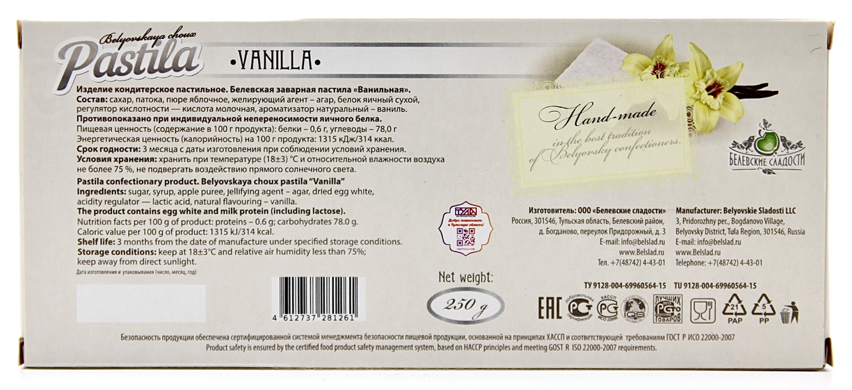 Насыщенный, завораживающий вкус белевской заварной пастилы — это воздушное облако ванили, мгновенно тающее во рту и оставляющее за собой чарующее, томное послевкусие. От него невозможно оторваться и сложно не прийти в восторг! Сложное сочетание вкусовых акцентов яркого, броского яблока и бархатной ванили прекрасно дополнит собой ежедневное чаепитие или праздничный ужин. Только натуральные компоненты в составе, только ручное приготовление и только восхитительное наслаждение!