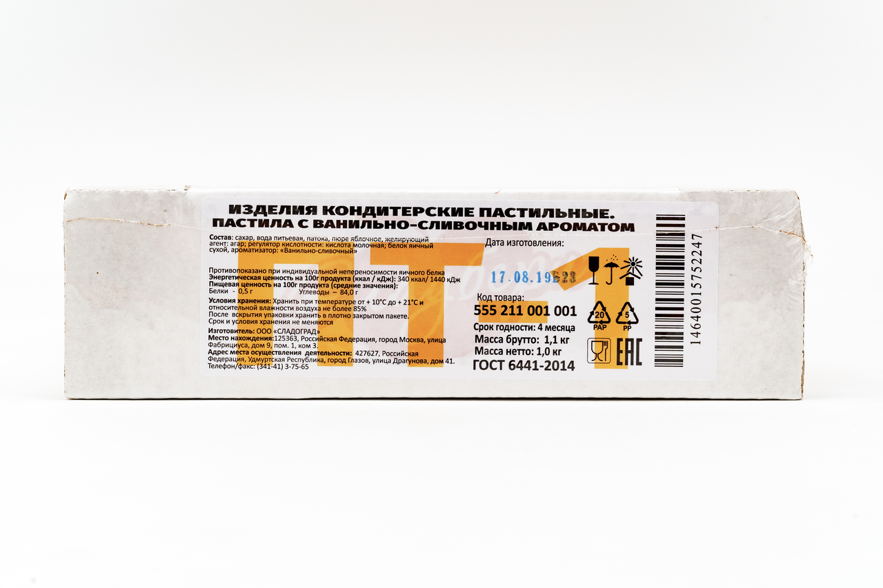 Сахар, вода, патока, пюре яблочное, желирующий агент: агар, регулятор кислотности: кислота молочная, белок яичный сухой, ароматизатор Ванильно-сливочный.