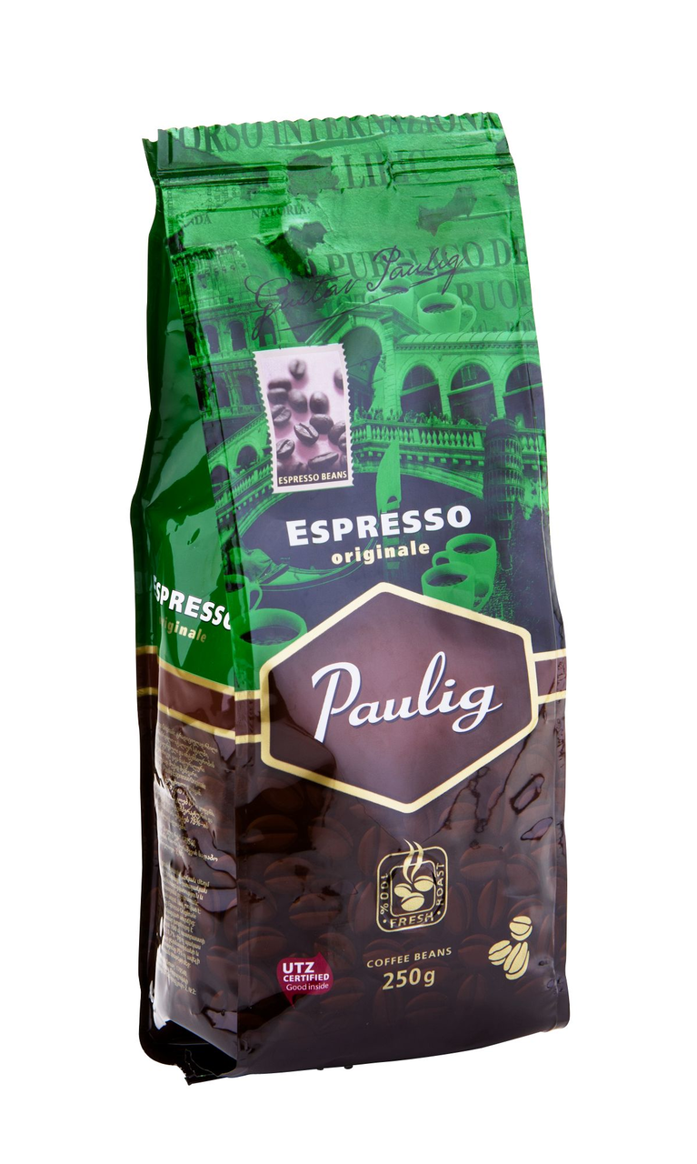 Кофе Paulig Espresso зерновой, 250 г. Натуральный мелко молотый темной обжарки. Сорт высший. Этот традиционно мягкий эспрессо, обжаренный в северо-итальянском стиле, дополняет щепотка робусты, придающая ему насыщенность и интенсивность. Помол для приготовления методом эспрессо. 7г на чашку кофе. 100 мл готового кофе содержит 2ккал энергии, массовая доля кофеина не менее 0,7%. Хранить в сухом и прохладном месте. Срок годности 18 месяцев.