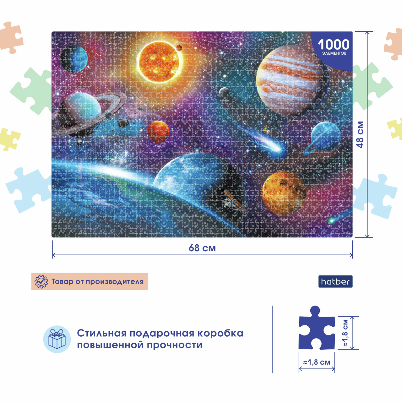 Premium пазлы 1000 элементов А2ф 680х480мм. Космос. Пазл премиум-класса состоит из 1000 элементов, дополнительно упакованных в прозрачный пакетик. Яркий красочный дизайн найдет своих почитателей среди настоящих любителей собирать мозаику. Для производства пазлов использован специально разработанный европейский картон для пазлов, толщина которого увеличена. Упаковка: стильная подарочная коробка в термоусадочную пленку. Конструкция полностью изготовлена из жесткого картона.