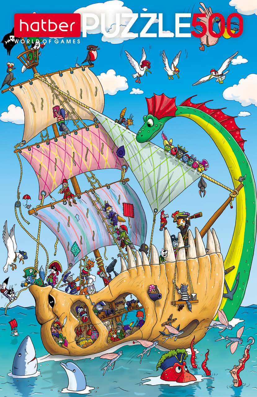 Пазлы для детей 500 элементов А2ф 330х480мм. Пиратский корабль. Пазл премиум-класса состоит из 500 элементов. Яркий красочный дизайн найдет своих почитателей среди настоящих любителей собирать мозаику. Для производства пазлов использован специально разработанный картон, толщина которого увеличена. Упаковка: стильная подарочная коробка в термоусадочной пленке.